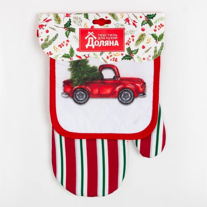 Кухонный новогодний набор Доляна «Новый год» цв.красный, прихватка 17*17 см, варежка 26*16 см,100% п/э