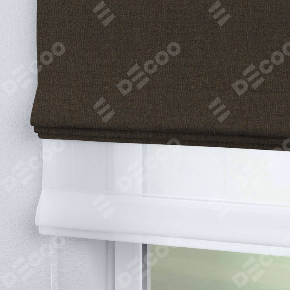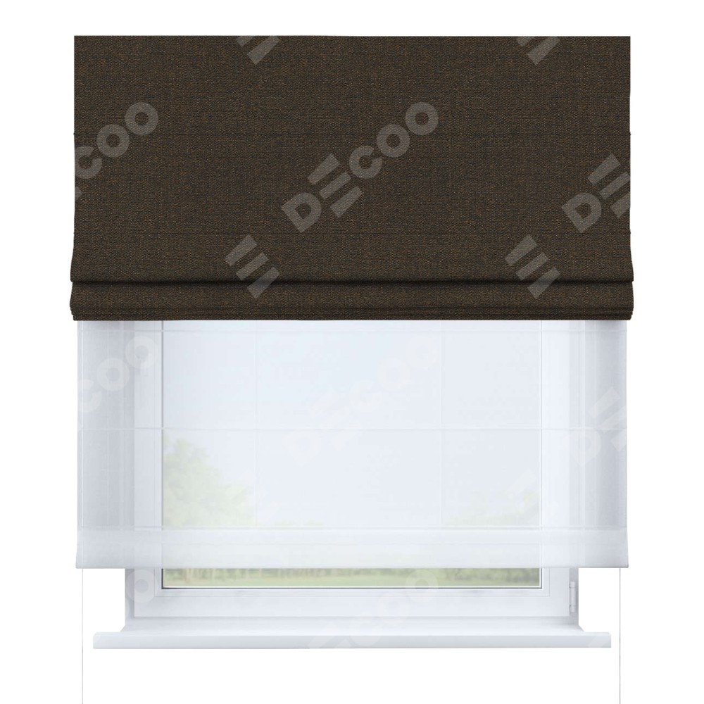 Римская штора день-ночь производителя «Cortin», используется для проёма, пошита из двух полотен, с лицевой стороны лён тёмно-коричневый артикул 53444, вторая ткань тюль (по стандарту комплектуется тюль белого цвета артикул V-01). Имеет универсальный механизм и подходит для монтажа: на потолок, на стену и в нишу.