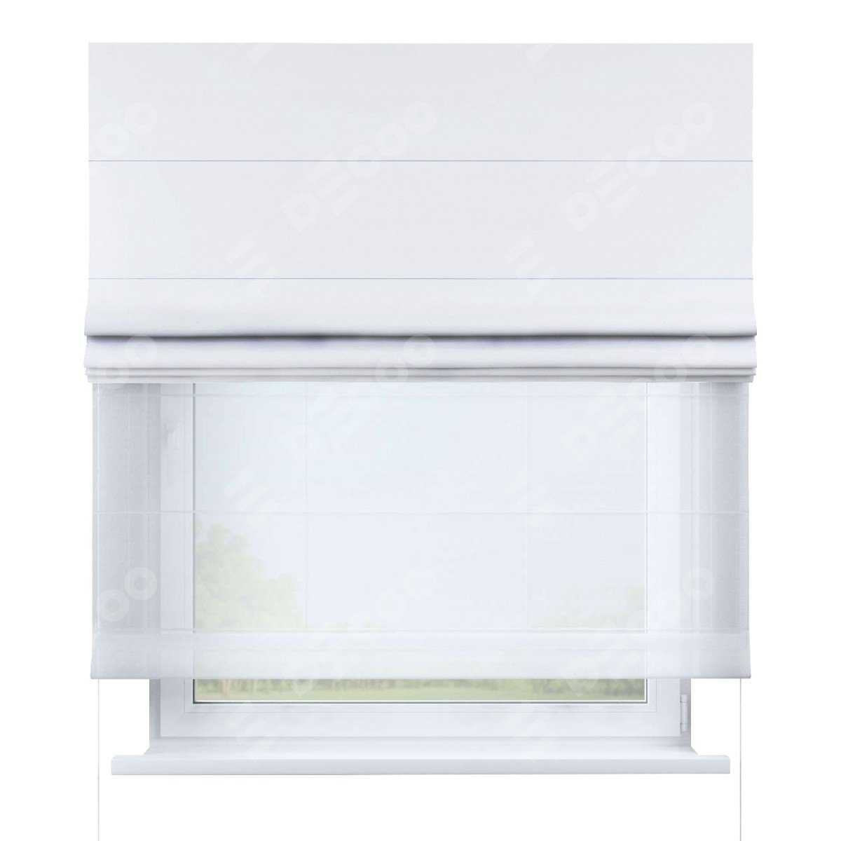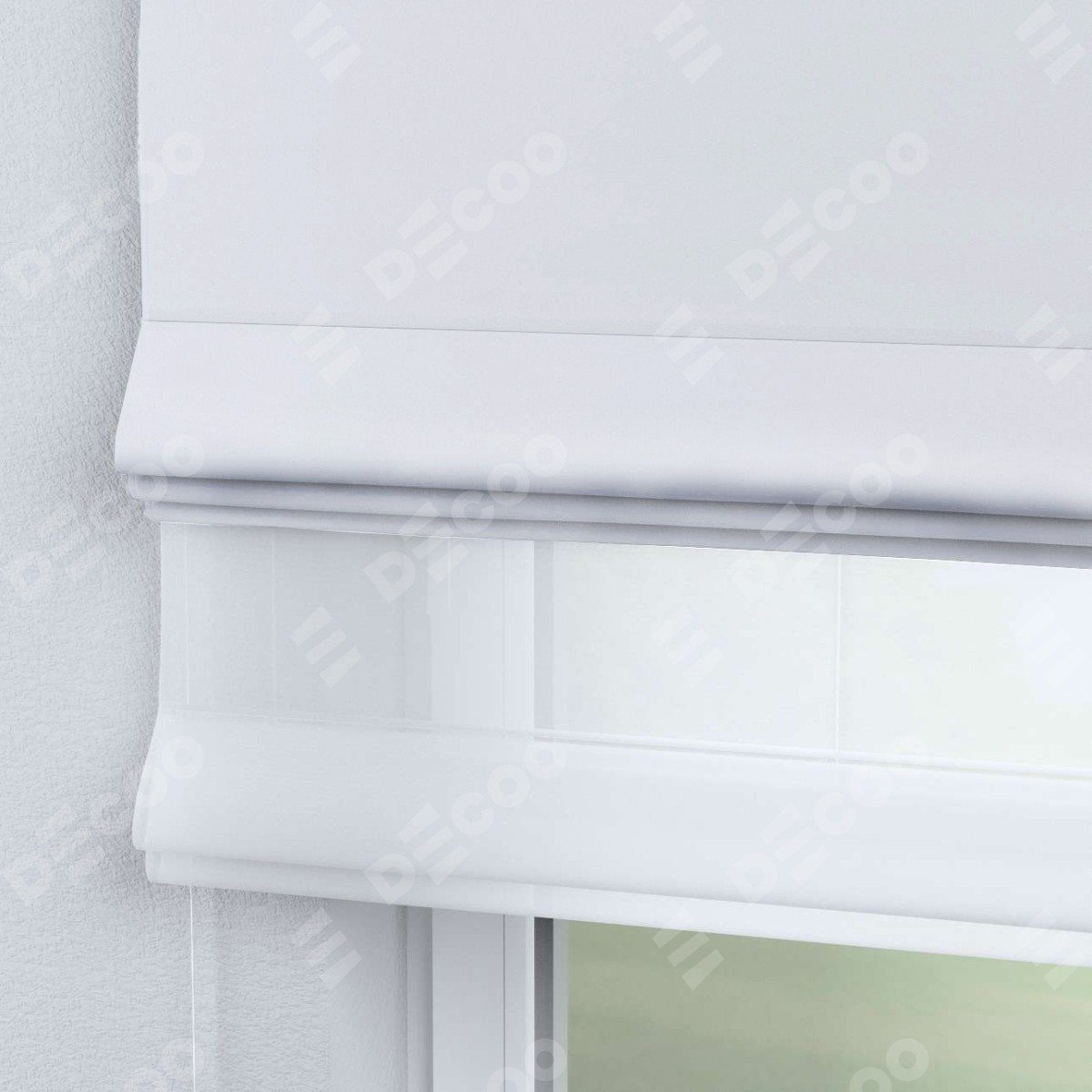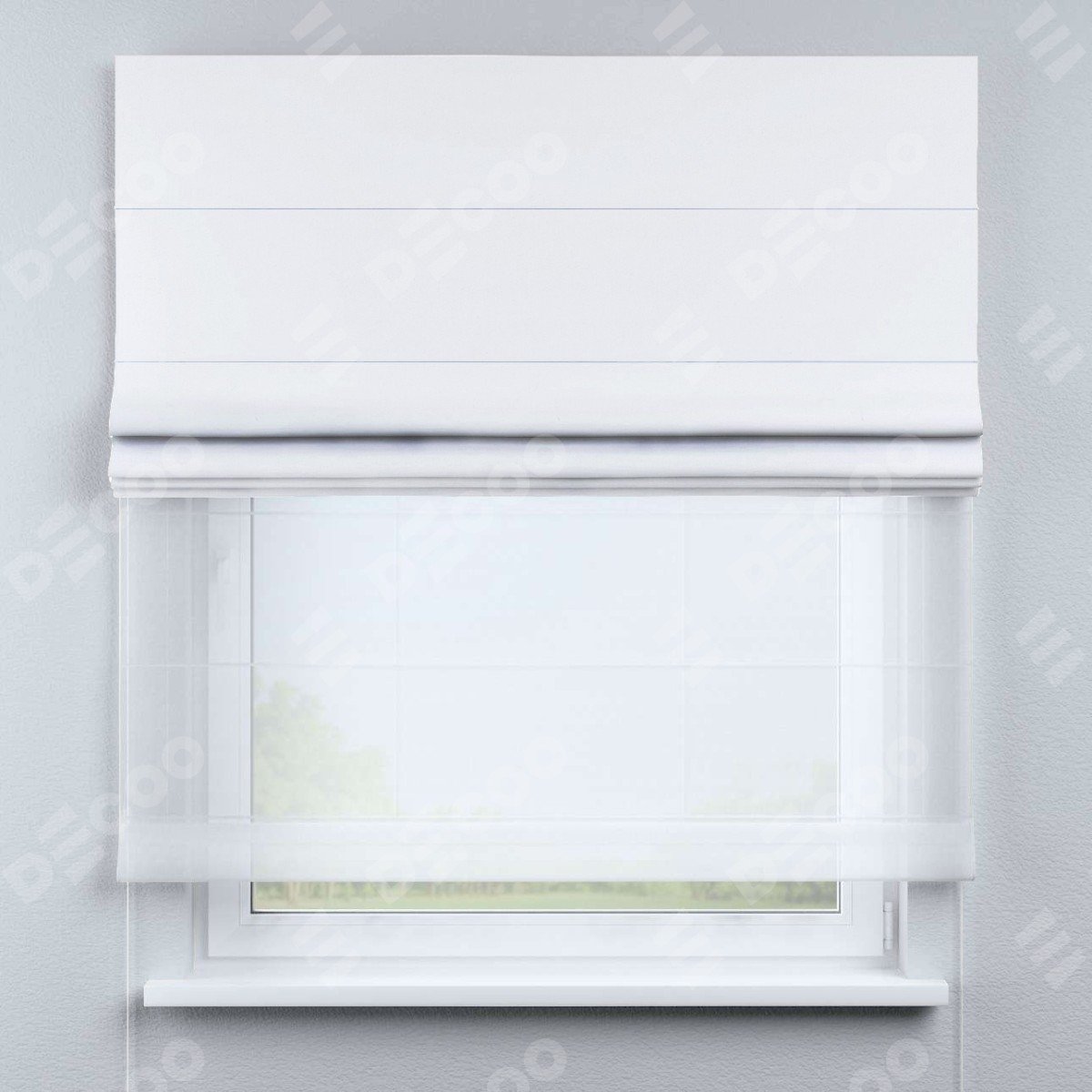 Римская штора день-ночь производителя «Cortin», используется для проёма, пошита из двух полотен, с лицевой стороны вельвет белый артикул 10810, вторая ткань тюль (по стандарту комплектуется тюль белого цвета артикул V-01). Имеет универсальный механизм и подходит для монтажа: на потолок, на стену и в нишу.