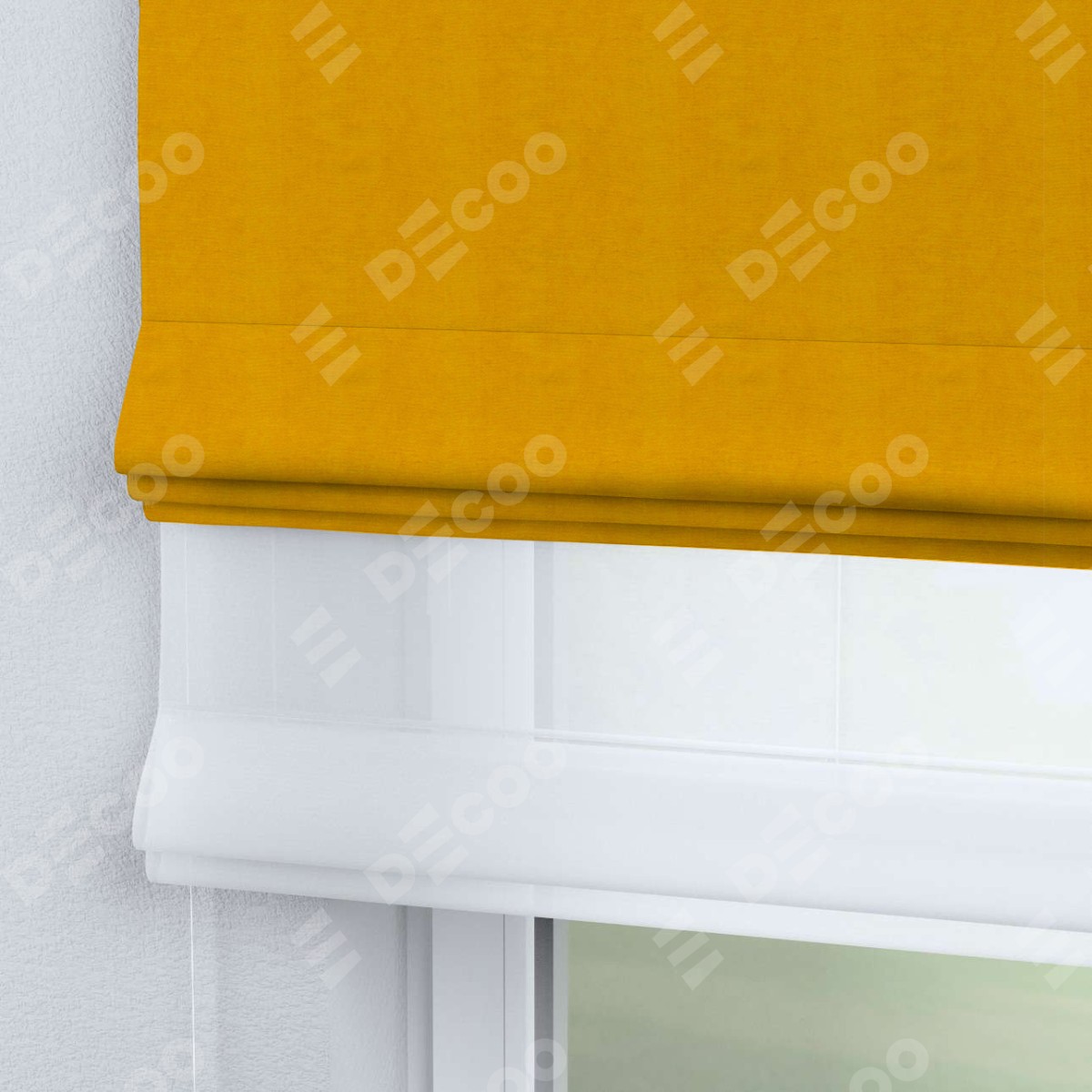 Римская штора день-ночь производителя «Cortin», используется для проёма, пошита из двух полотен, с лицевой стороны вельвет желтый артикул 85547, вторая ткань тюль (по стандарту комплектуется тюль белого цвета артикул V-01). Имеет универсальный механизм и подходит для монтажа: на потолок, на стену и в нишу.