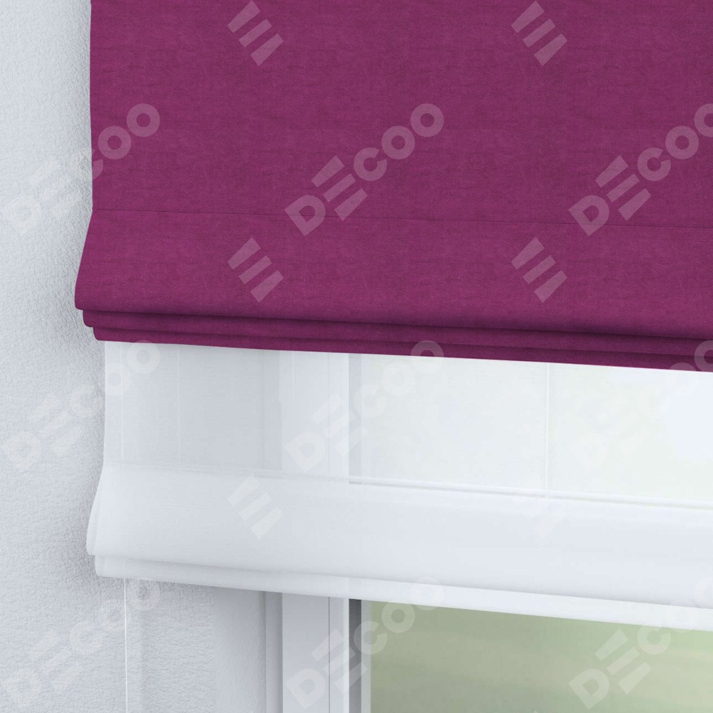 Римская штора день-ночь производителя «Cortin», используется для проёма, пошита из двух полотен, с лицевой стороны вельвет фиолетовый артикул 85552, вторая ткань тюль (по стандарту комплектуется тюль белого цвета артикул V-01). Имеет универсальный механизм и подходит для монтажа: на потолок, на стену и в нишу.
