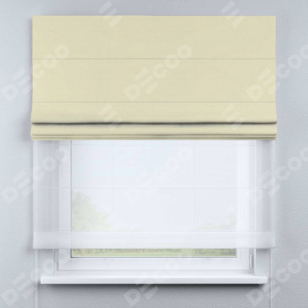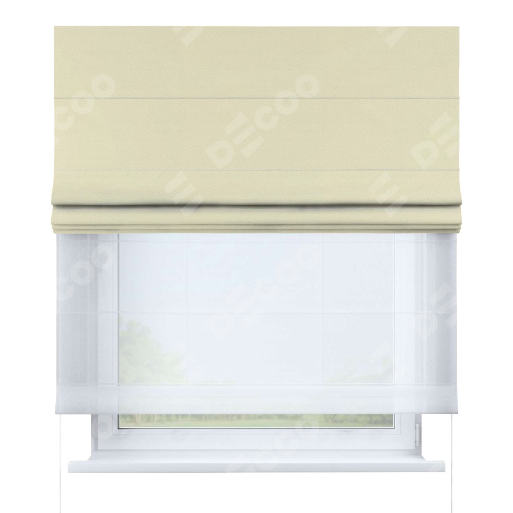 Римская штора день-ночь производителя «Cortin», используется для проёма, пошита из двух полотен, с лицевой стороны блэкаут однотонный бежевый артикул 88283, вторая ткань тюль (по стандарту комплектуется тюль белого цвета артикул V-01). Имеет универсальный механизм и подходит для монтажа: на потолок, на стену и в нишу.