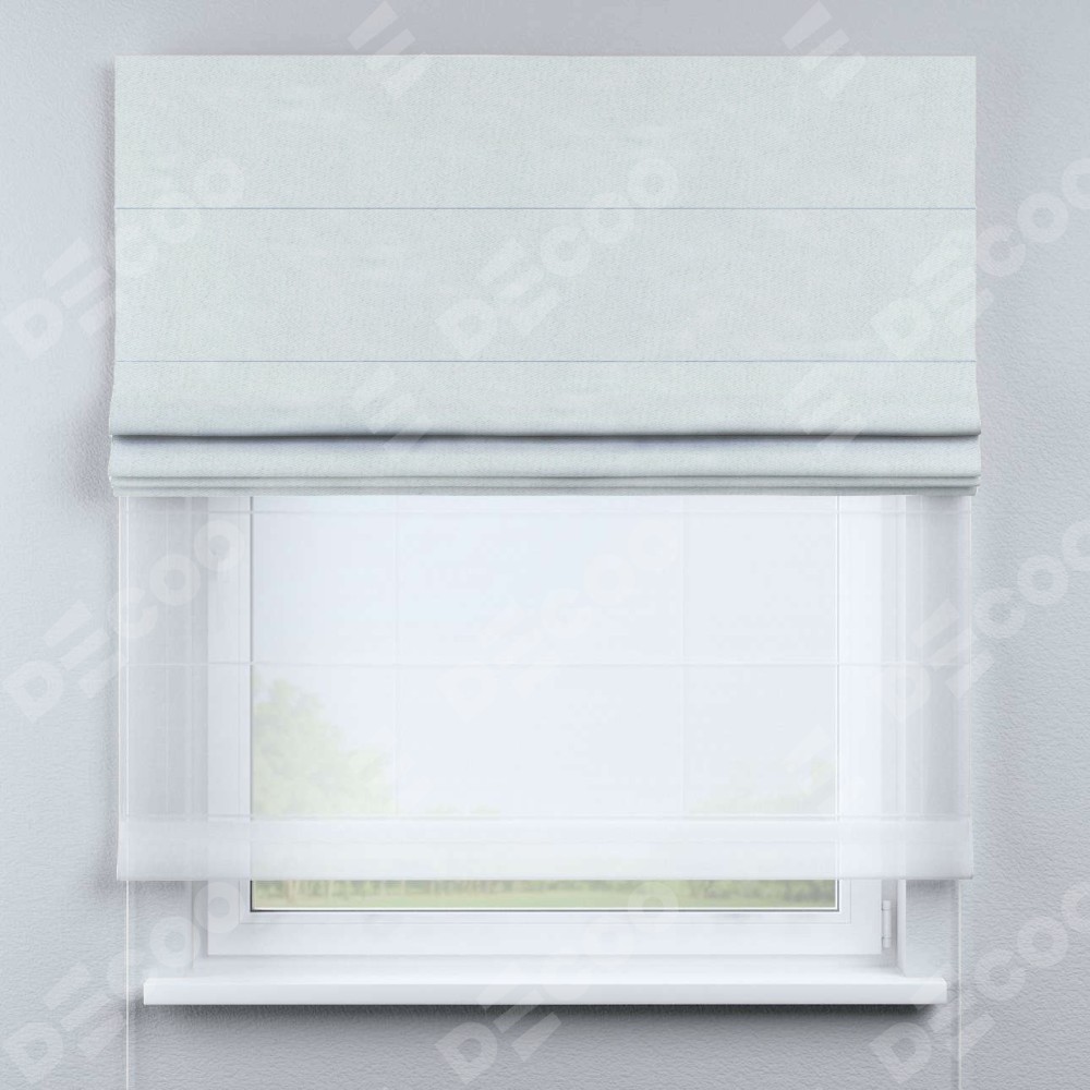 Римская штора день-ночь производителя «Cortin», используется для проёма, пошита из двух полотен, с лицевой стороны блэкаут однотонный дымчато-молочный артикул 88282, вторая ткань тюль (по стандарту комплектуется тюль белого цвета артикул V-01). Имеет универсальный механизм и подходит для монтажа: на потолок, на стену и в нишу.