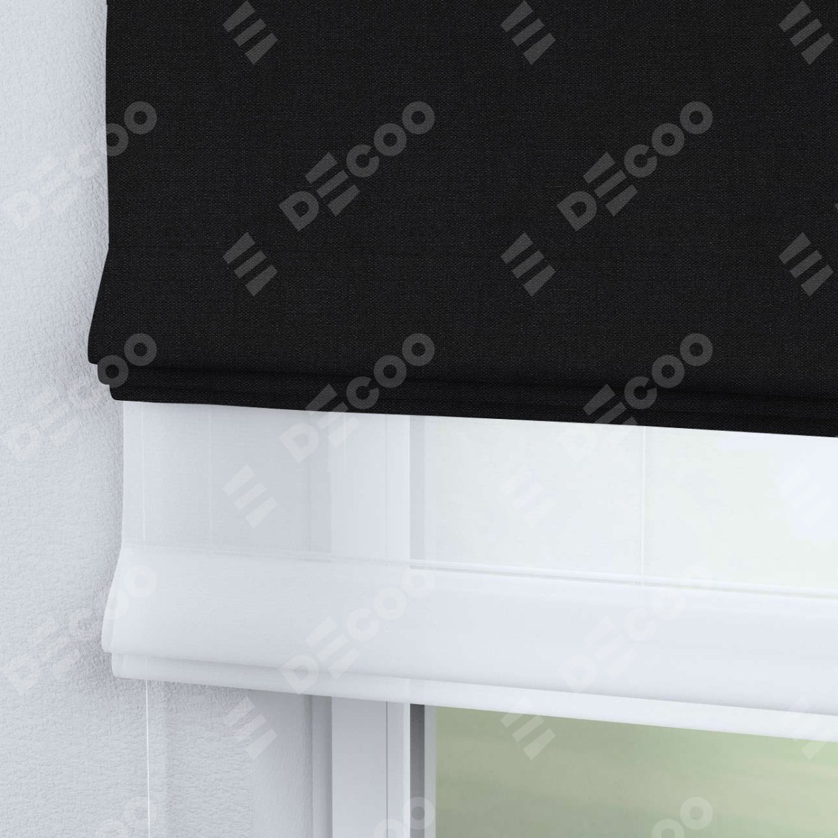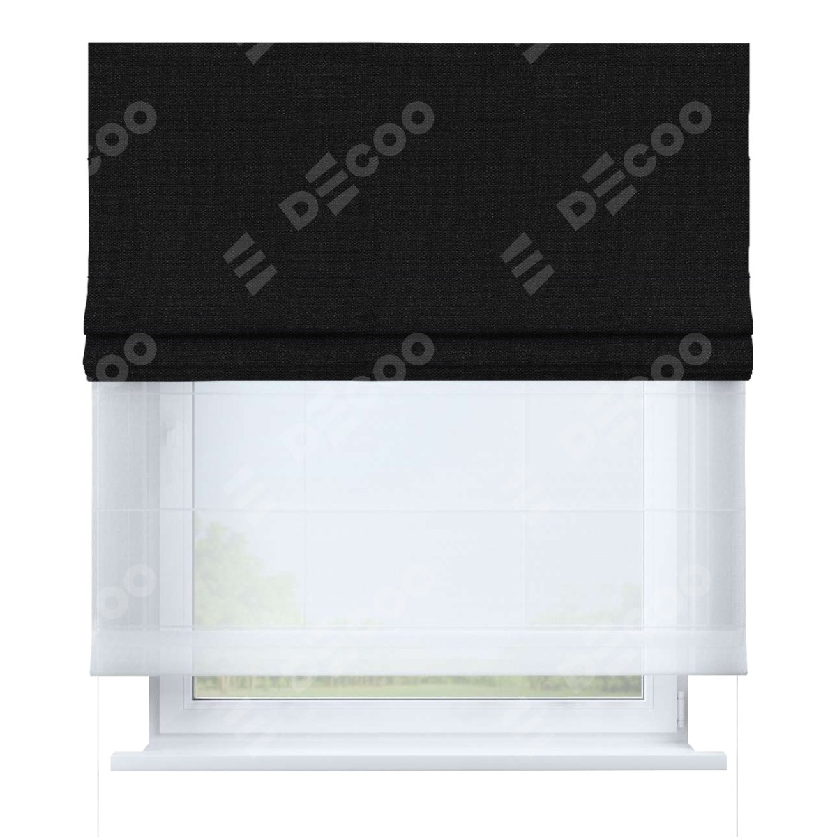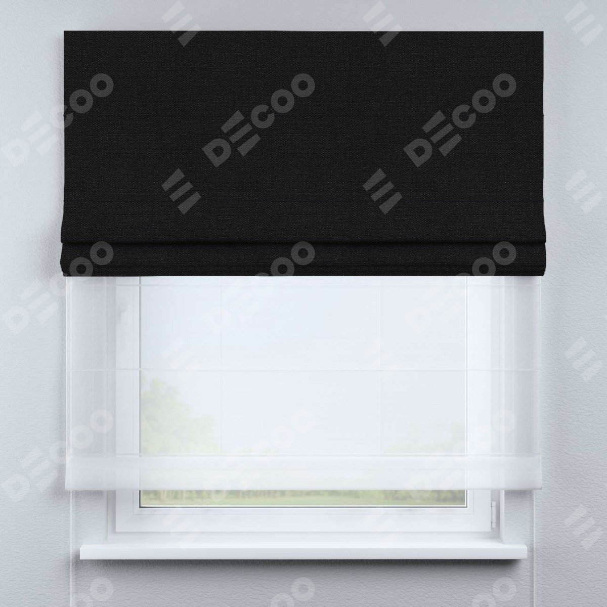 Римская штора день-ночь производителя «Cortin», используется для проёма, пошита из двух полотен, с лицевой стороны лён чёрный артикул 85927, вторая ткань тюль (по стандарту комплектуется тюль белого цвета артикул V-01). Имеет универсальный механизм и подходит для монтажа: на потолок, на стену и в нишу.