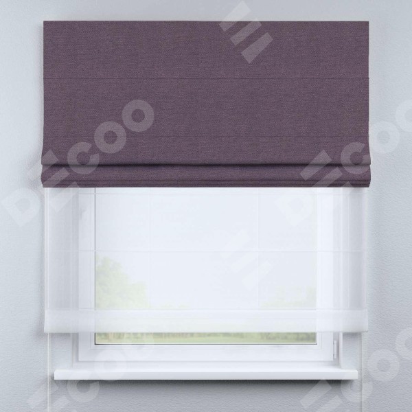 Римская штора день-ночь производителя «Cortin», используется для проёма, пошита из двух полотен, с лицевой стороны лён димаут светло-фиолетовый артикул 83034, вторая ткань тюль (по стандарту комплектуется тюль белого цвета артикул V-01). Имеет универсальный механизм и подходит для монтажа: на потолок, на стену и в нишу.