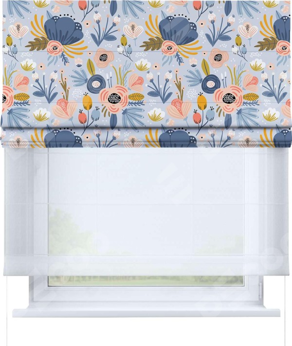 Римская штора день-ночь производителя «Cortin», используется для проёма, пошита из двух полотен, с лицевой блэкаут с нанесением сублимационной печати «Волшебные цветы», вторая ткань тюль (по стандарту комплектуется тюль белого цвета артикул V-01). Имеет универсальный механизм и подходит для монтажа: на потолок, на стену и в нишу.