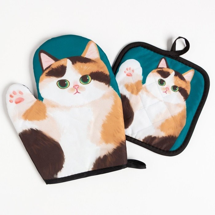 Кухонный набор (2 предмета) Доляна Котики «Василий», прихватка 17×17 см, варежка 24*18 см, 100% п/э