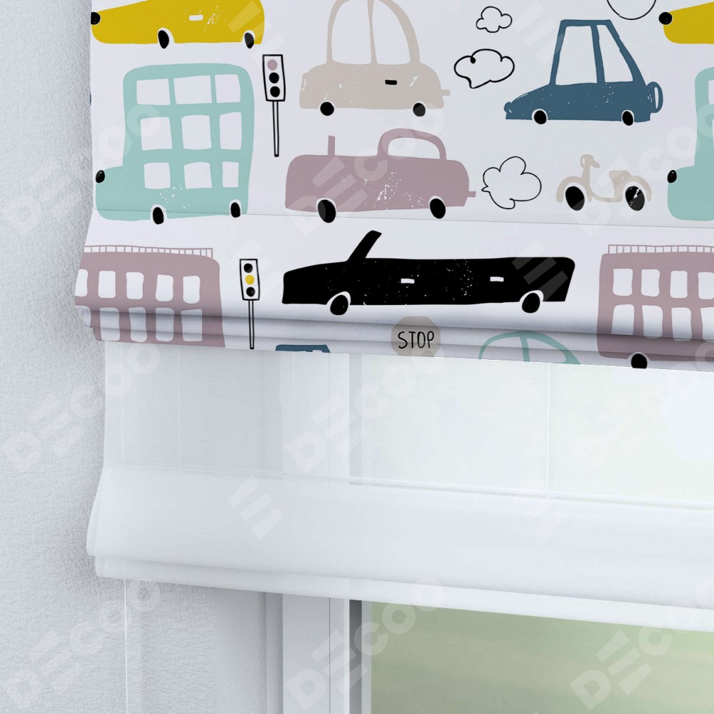 Римская штора день-ночь производителя «Cortin», используется для проёма, пошита из двух полотен, с лицевой блэкаут с нанесением сублимационной печати «Красочный трафик», вторая ткань тюль (по стандарту комплектуется тюль белого цвета артикул V-01). Имеет универсальный механизм и подходит для монтажа: на потолок, на стену и в нишу.