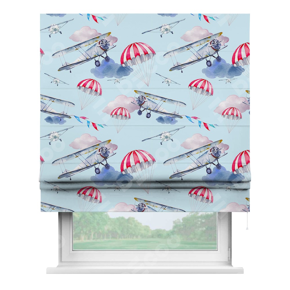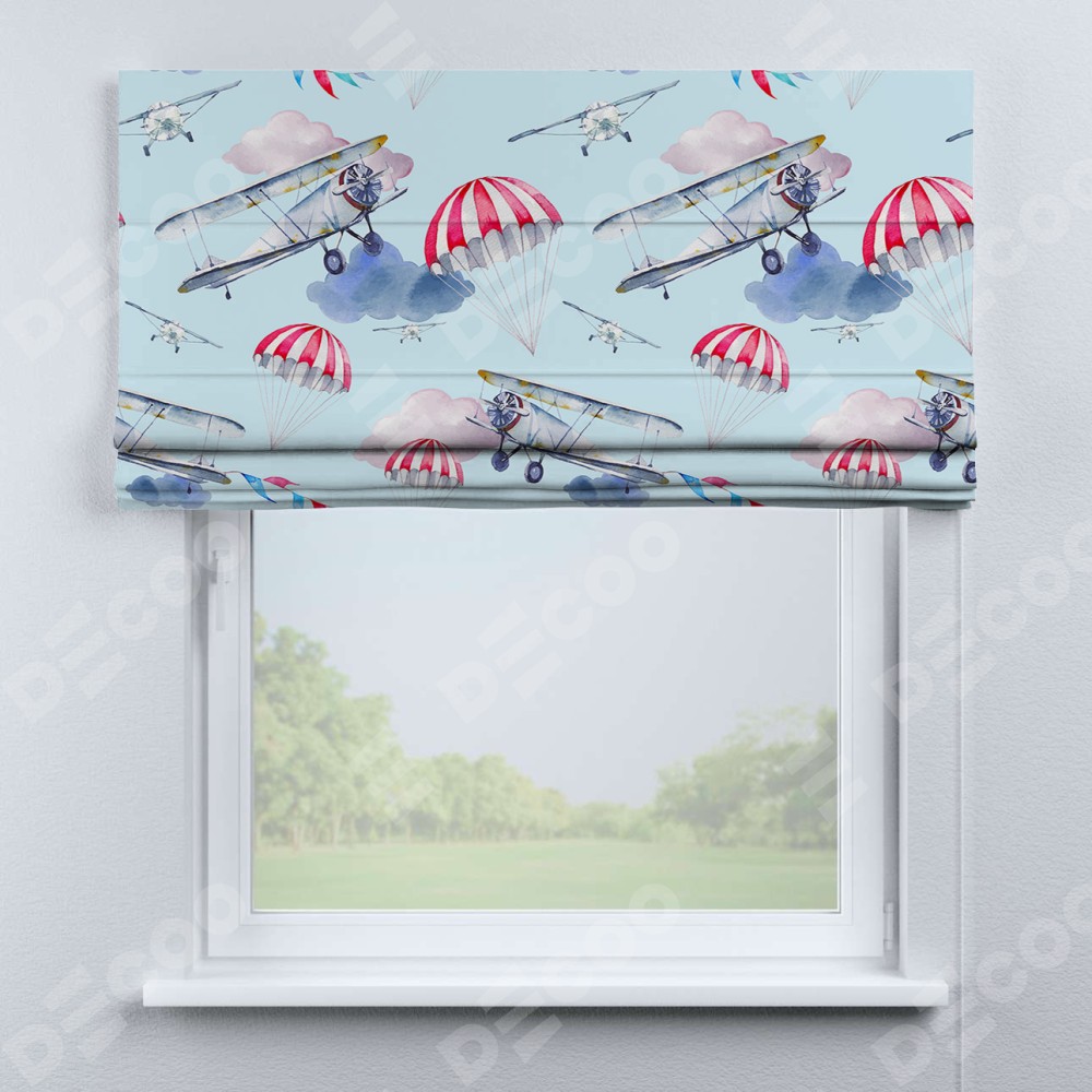 Римская штора производителя «Cortin», используется для проёма, пошита из ткани блэкаут с нанесением сублимационной печати «Самолёт». Имеет универсальный механизм и подходит для монтажа: на потолок, на стену и в нишу.