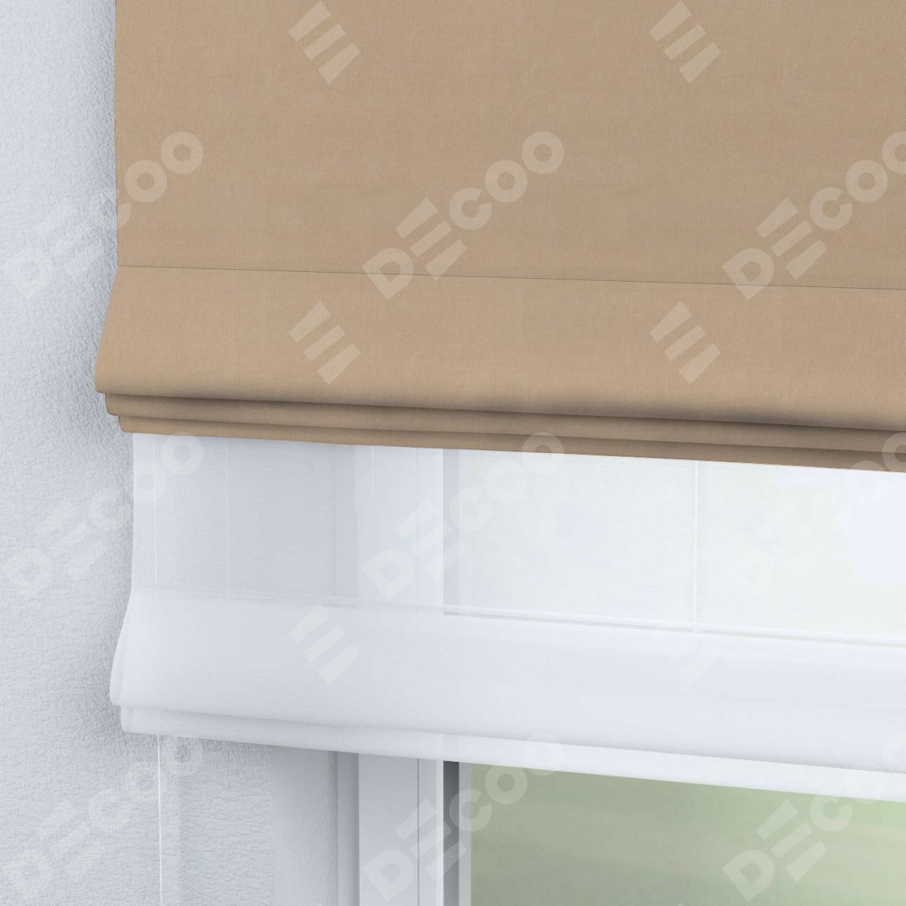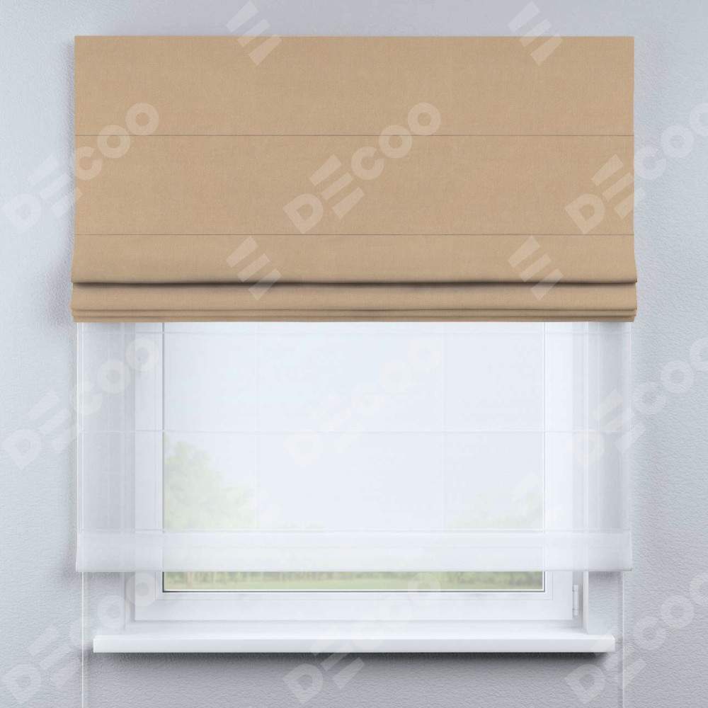 Римская штора день-ночь производителя «Cortin», используется для проёма, пошита из двух полотен, с лицевой стороны вельвет песочный артикул 17740, вторая ткань тюль (по стандарту комплектуется тюль белого цвета артикул V-01). Имеет универсальный механизм и подходит для монтажа: на потолок, на стену и в нишу.