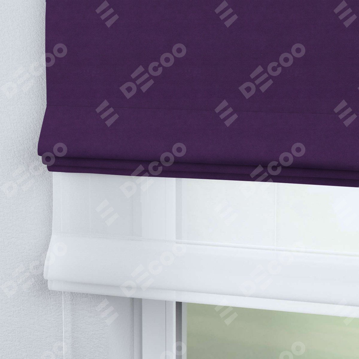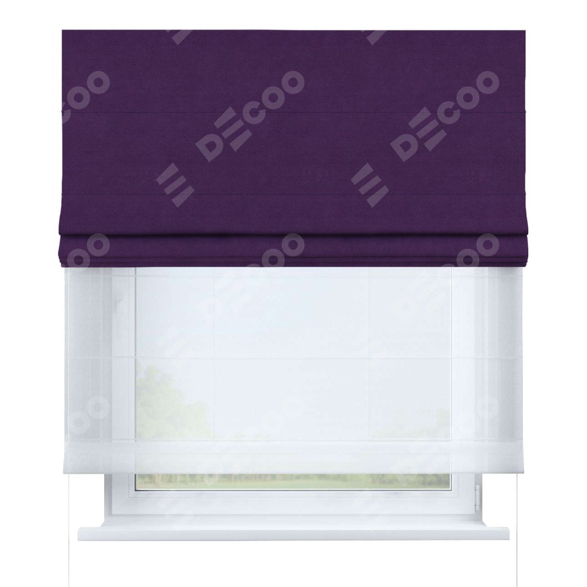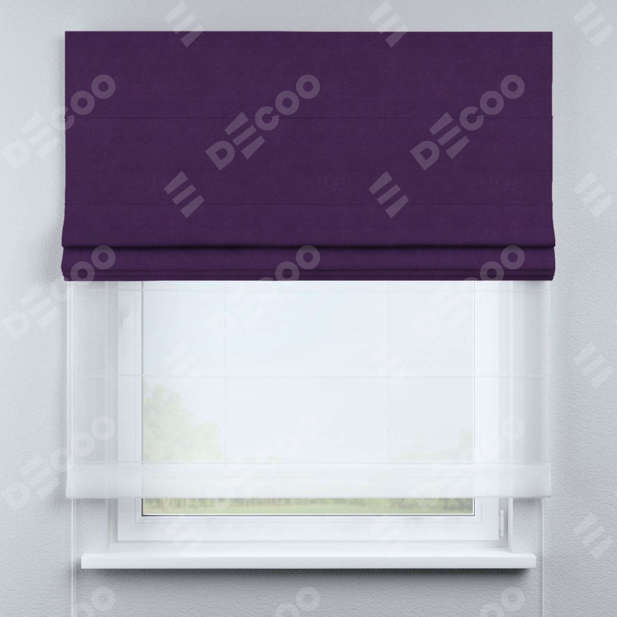 Римская штора день-ночь производителя «Cortin», используется для проёма, пошита из двух полотен, с лицевой стороны вельвет тёмно-фиолетовый артикул 17753, вторая ткань тюль (по стандарту комплектуется тюль белого цвета артикул V-01). Имеет универсальный механизм и подходит для монтажа: на потолок, на стену и в нишу.