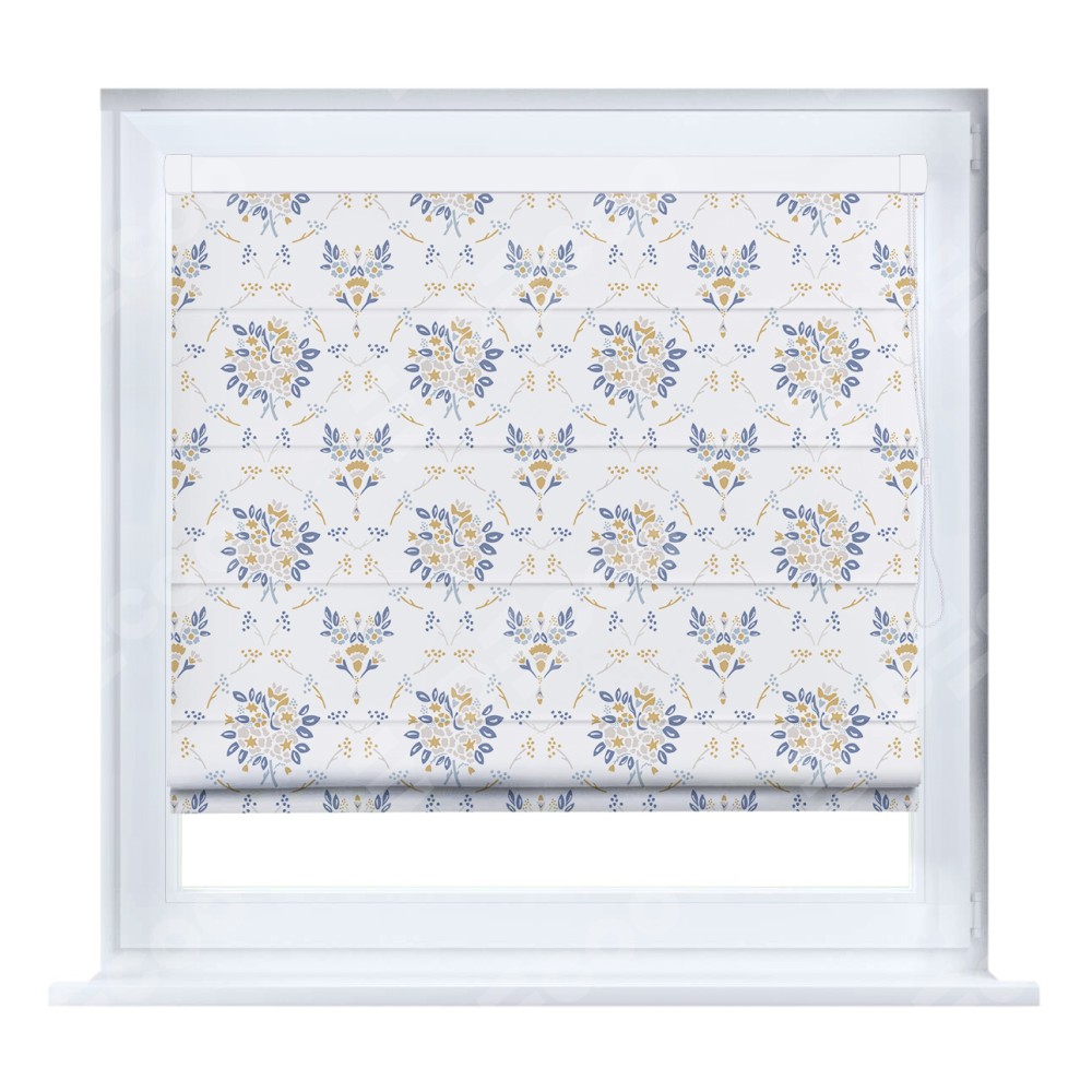 Римская штора кассетного типа, производителя «Cortin», устанавливается только на пластиковые окна и прилегает к стеклопакету, пошита из ткани блэкаут с нанесением сублимационной печати «Французский цветок».
