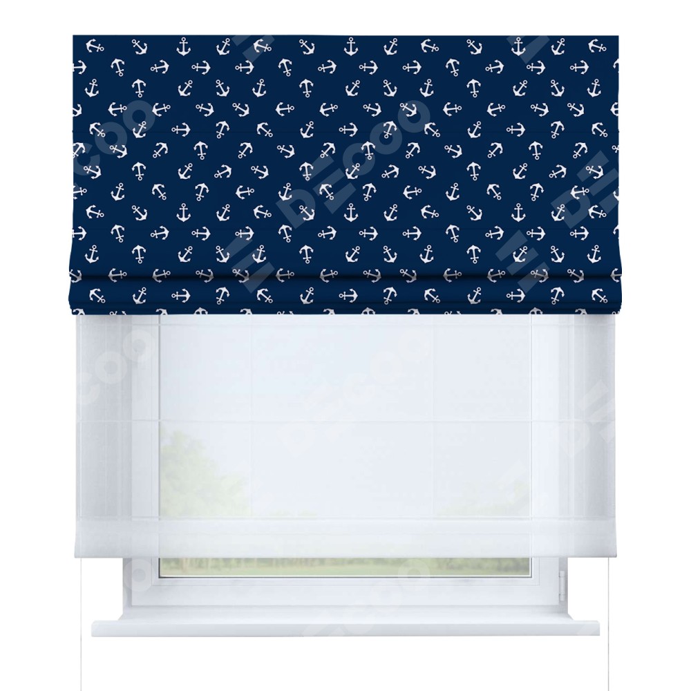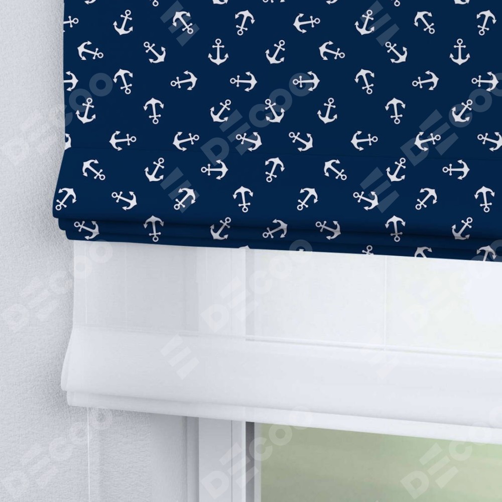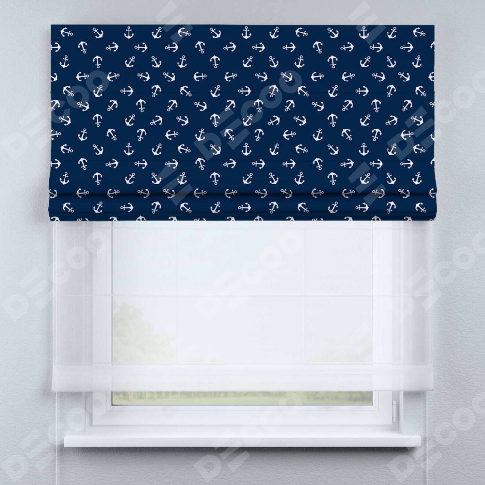 Римская штора день-ночь производителя «Cortin», используется для проёма, пошита из двух полотен, с лицевой блэкаут с нанесением сублимационной печати «Морские якори», вторая ткань тюль (по стандарту комплектуется тюль белого цвета артикул V-01). Имеет универсальный механизм и подходит для монтажа: на потолок, на стену и в нишу.