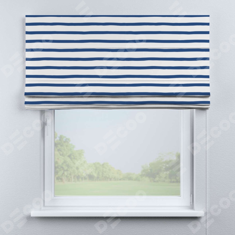 Римская штора производителя «Cortin», используется для проёма, пошита из ткани блэкаут с нанесением сублимационной печати «Морская полоска». Имеет универсальный механизм и подходит для монтажа: на потолок, на стену и в нишу.