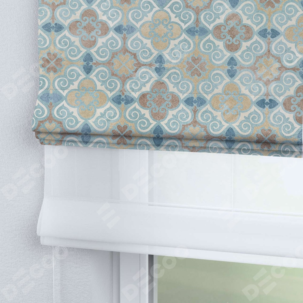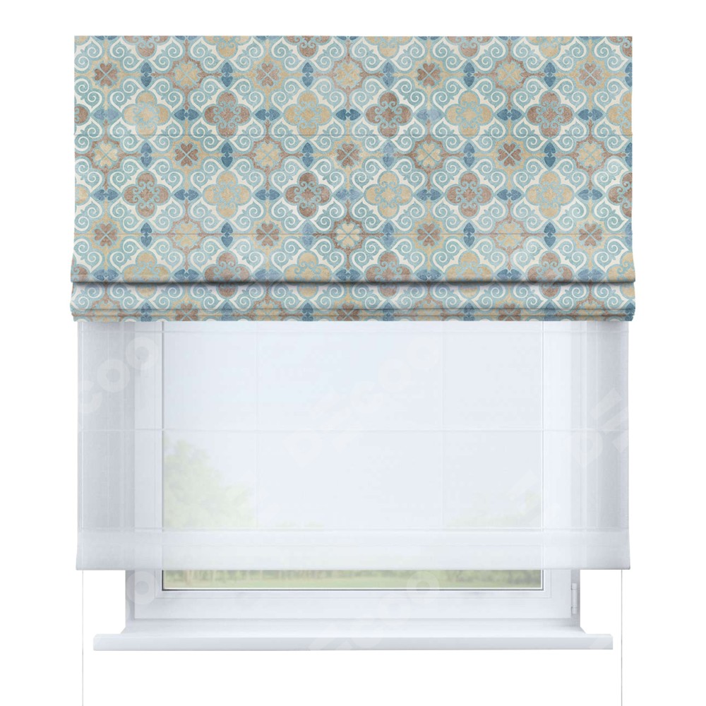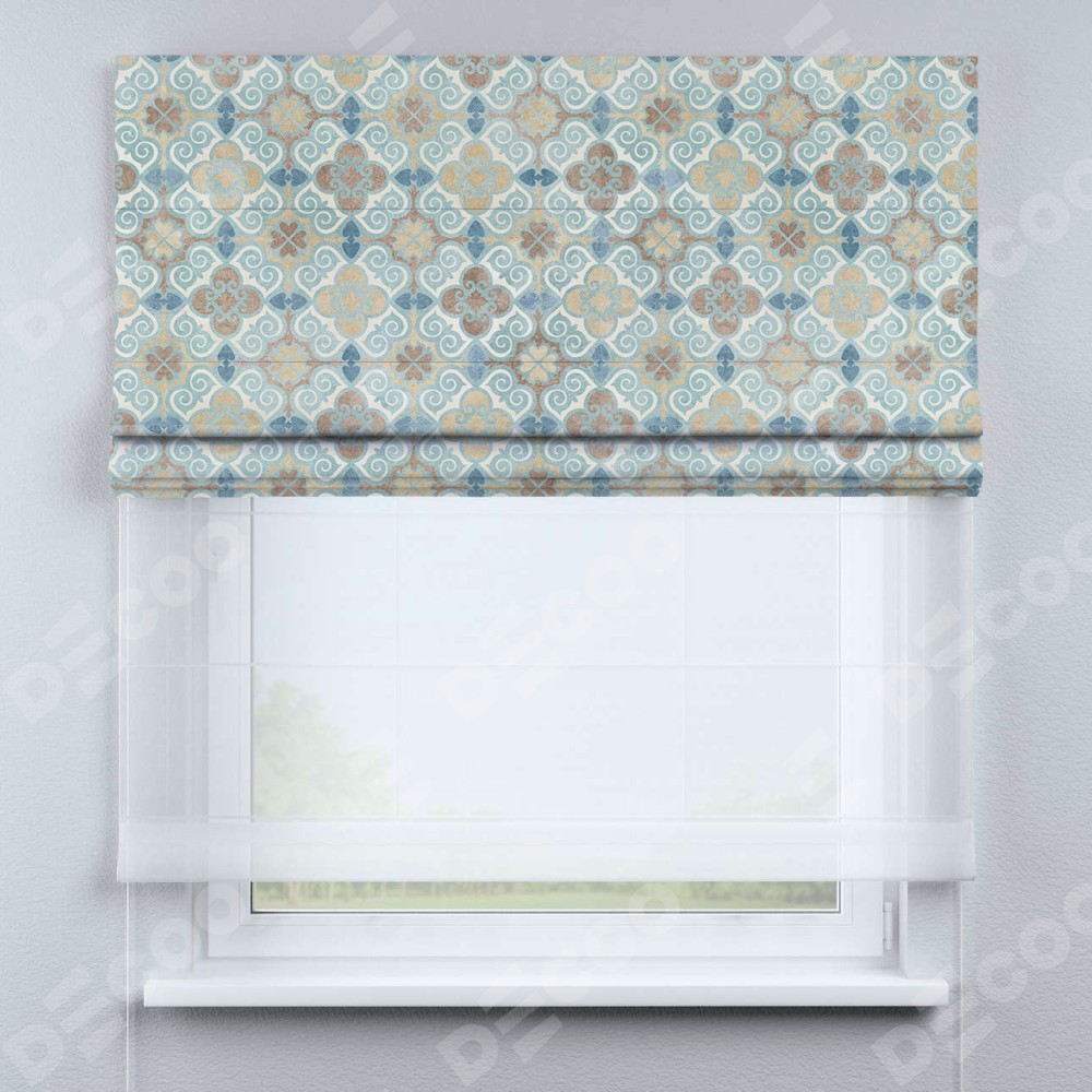 Римская штора день-ночь производителя «Cortin», используется для проёма, пошита из двух полотен, с лицевой блэкаут с нанесением сублимационной печати «Фарида», вторая ткань тюль (по стандарту комплектуется тюль белого цвета артикул V-01). Имеет универсальный механизм и подходит для монтажа: на потолок, на стену и в нишу.