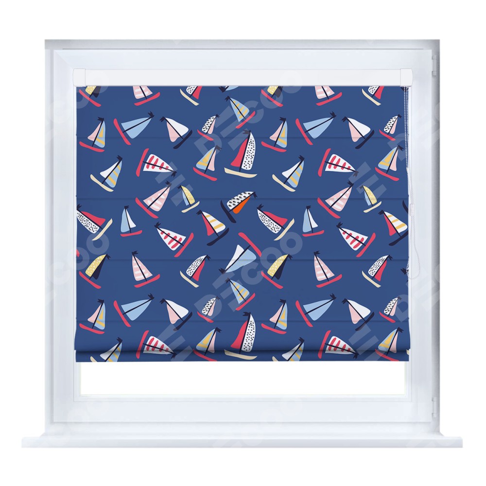 Римская штора кассетного типа, производителя «Cortin», устанавливается только на пластиковые окна и прилегает к стеклопакету, пошита из ткани блэкаут с нанесением сублимационной печати «Морское приключение».