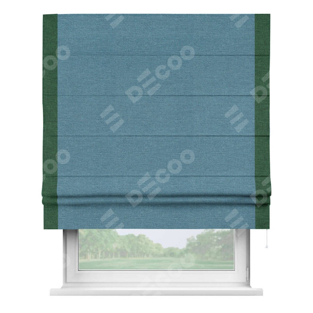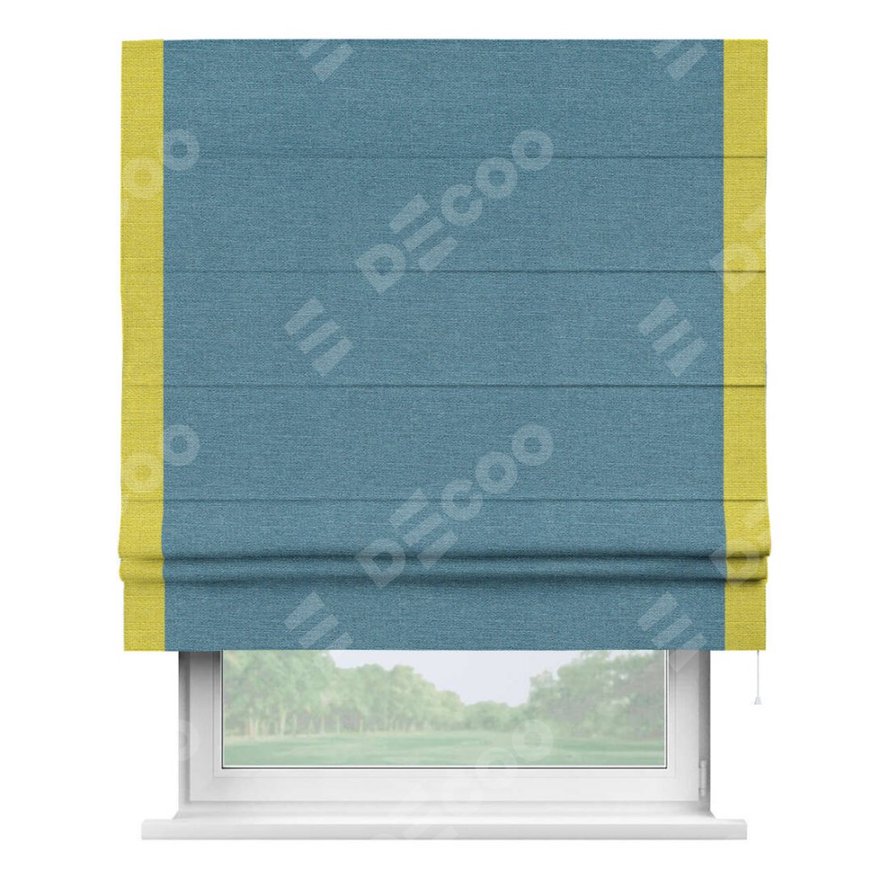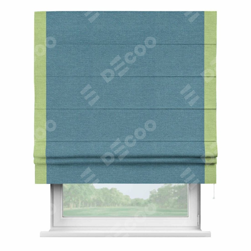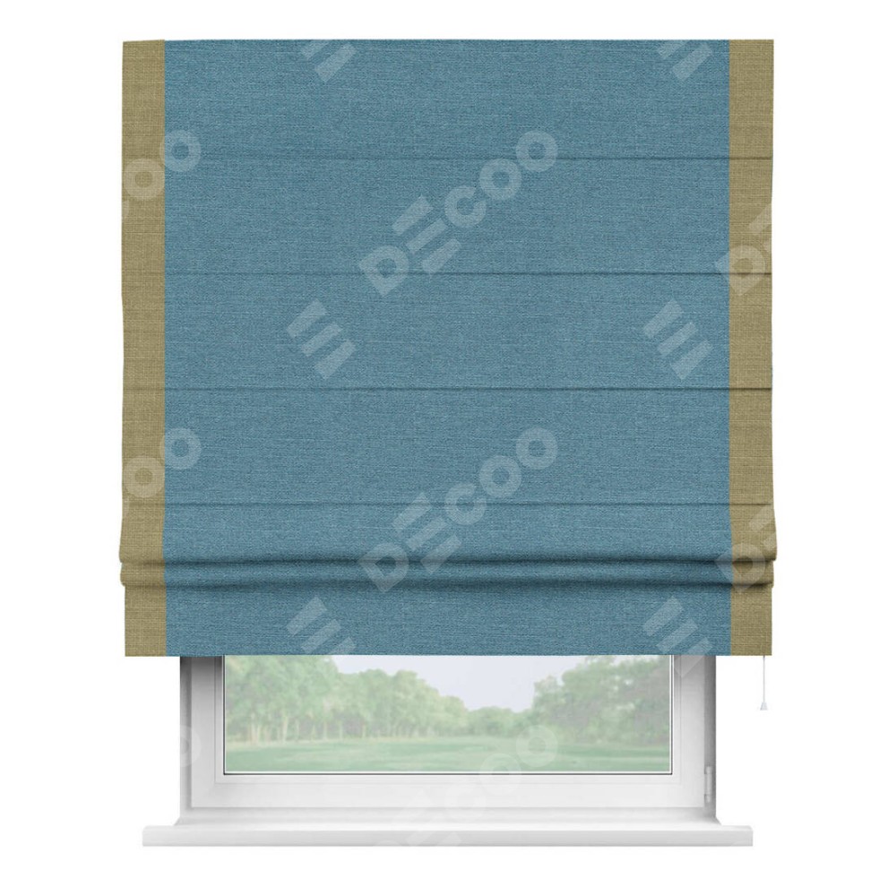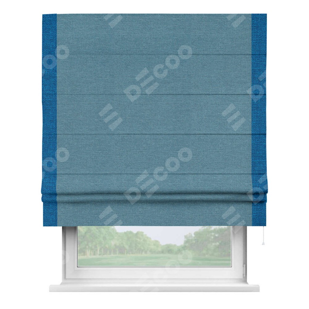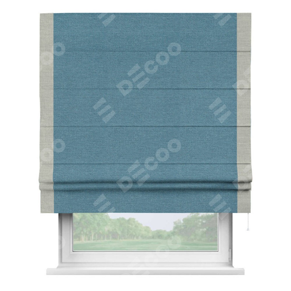 Римская штора производителя «Cortin», используется для проёма, пошита из ткани лён голубой, артикул 63741. Отделка шторы кантом «Стрим Дуо», ткань для канта используется из льна разной расцветки на выбор. Имеет универсальный механизм и подходит для монтажа: на потолок, на стену и в нишу.