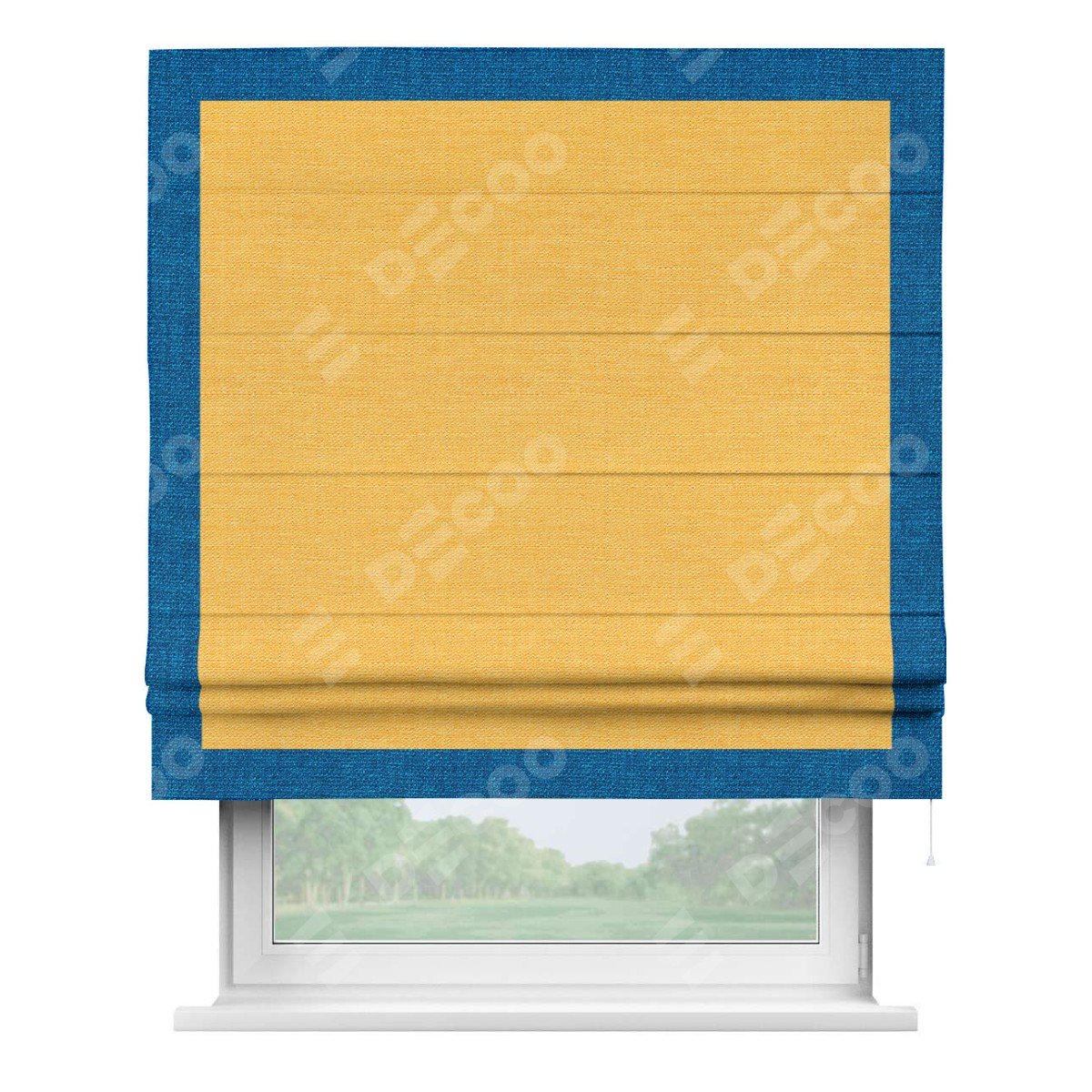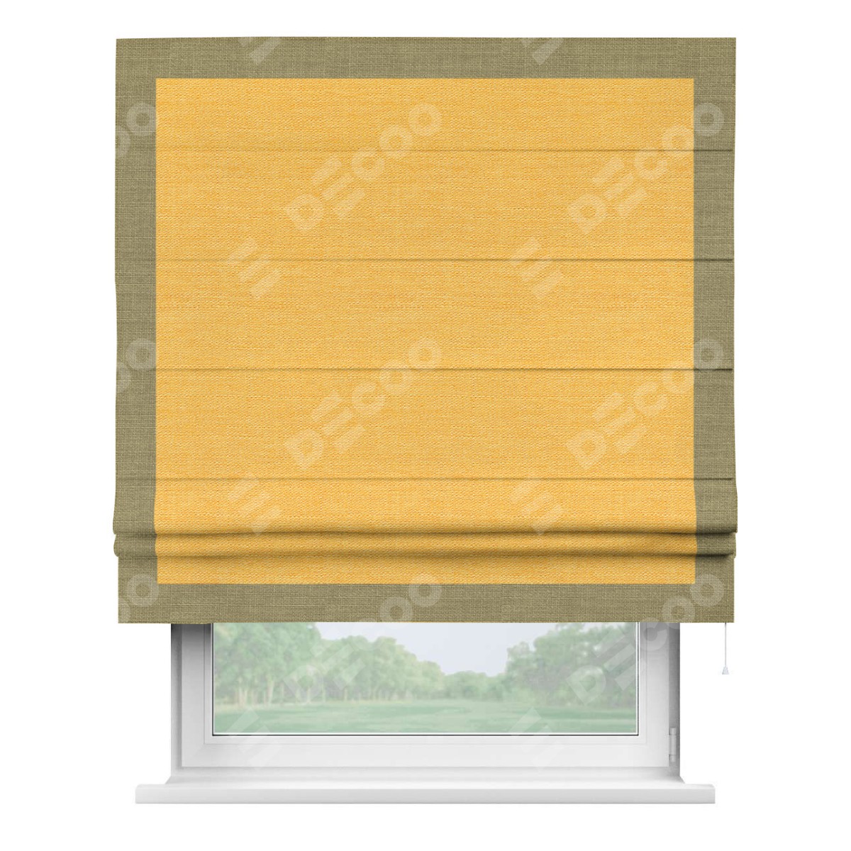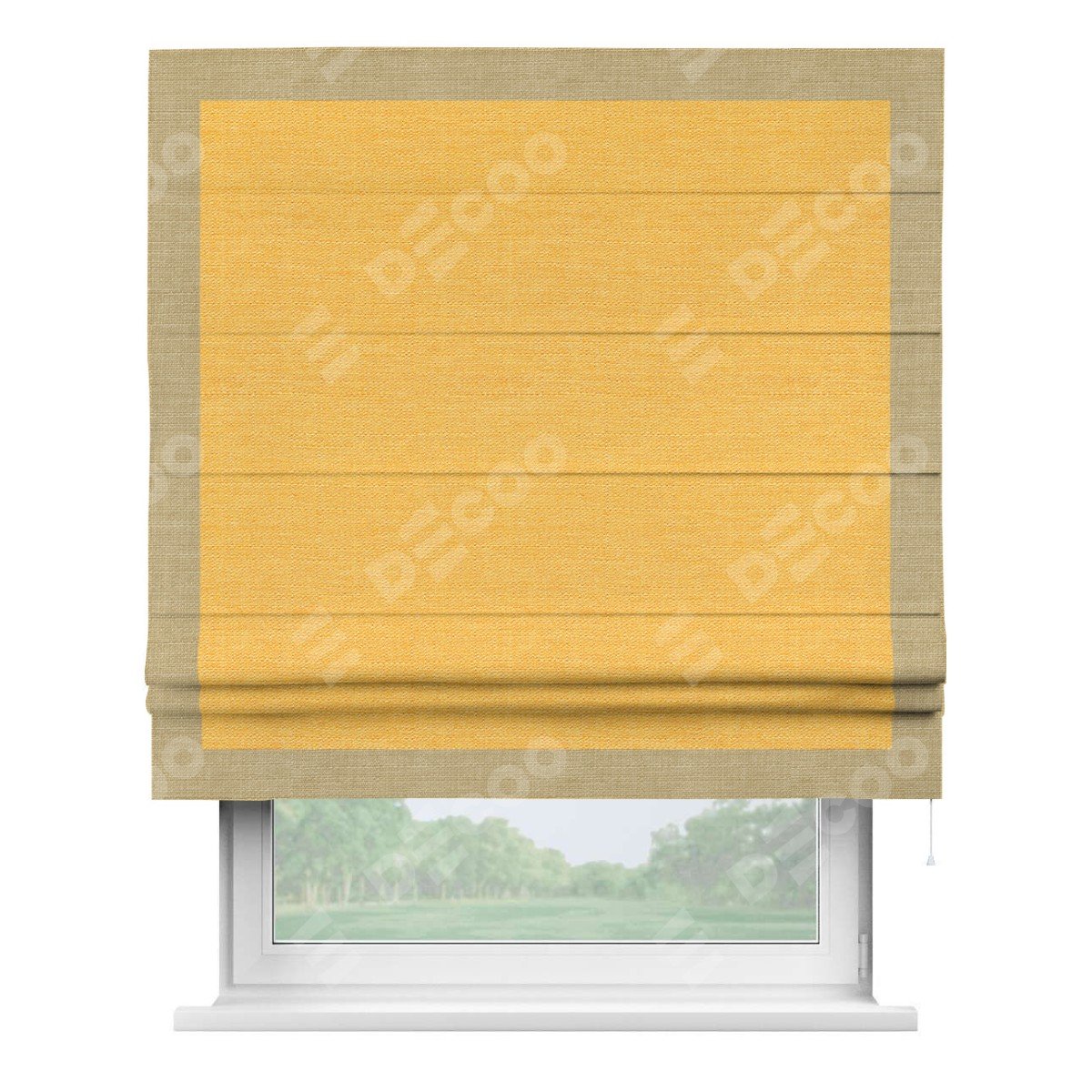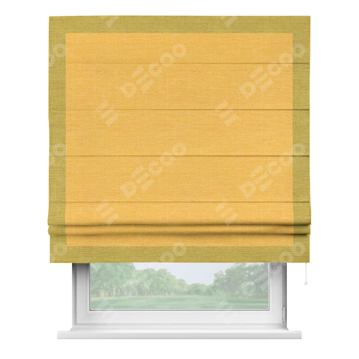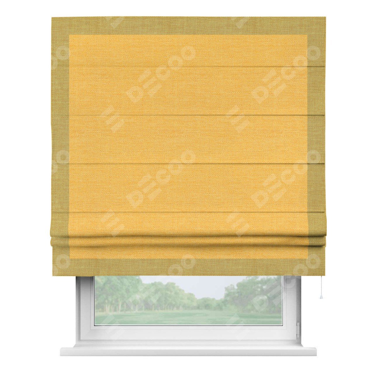 Римская штора производителя «Cortin», используется для проёма, пошита из ткани лён желтый, артикул 63738. Отделка шторы кантом «Чесс», ткань для канта используется из льна разной расцветки на выбор. Имеет универсальный механизм и подходит для монтажа: на потолок, на стену и в нишу.