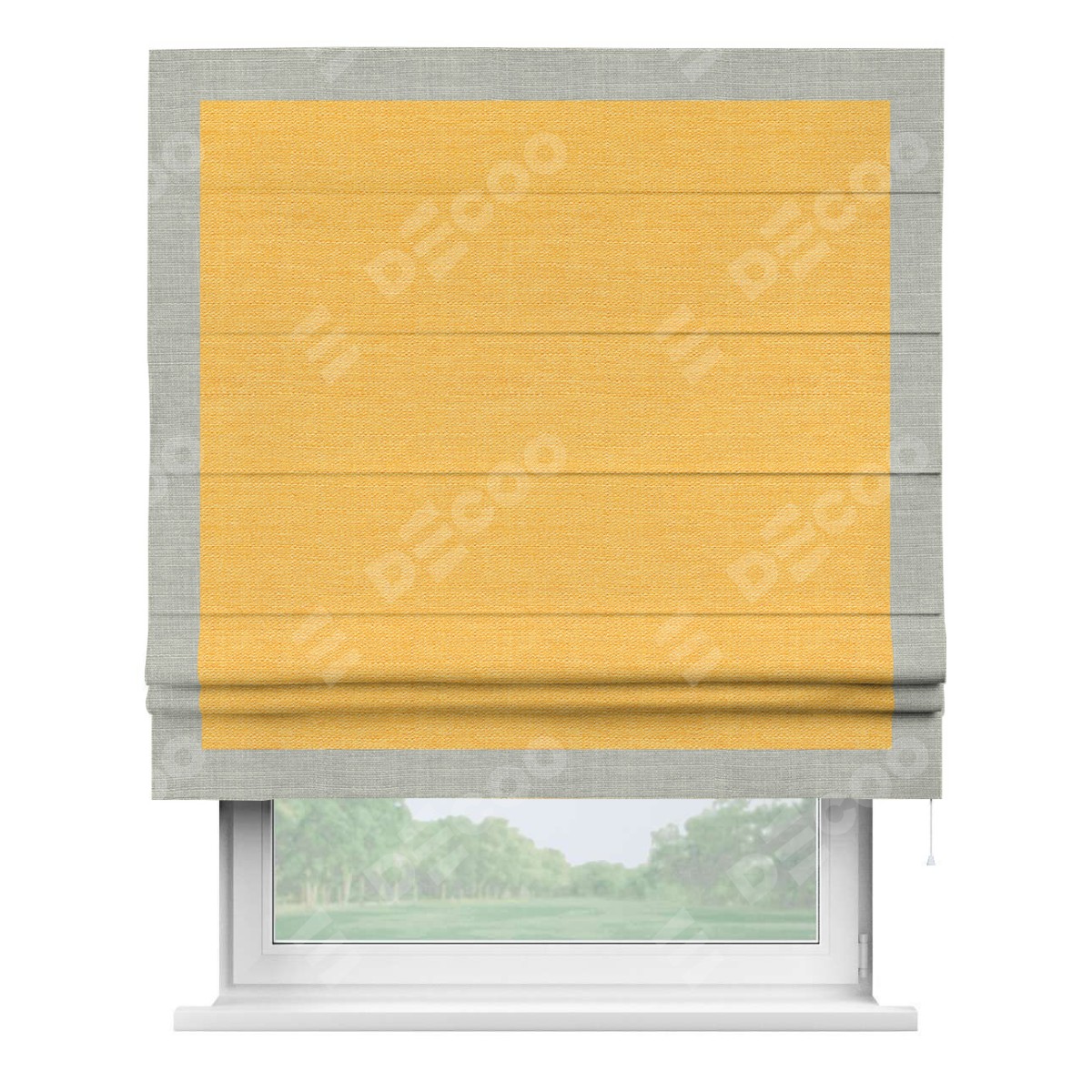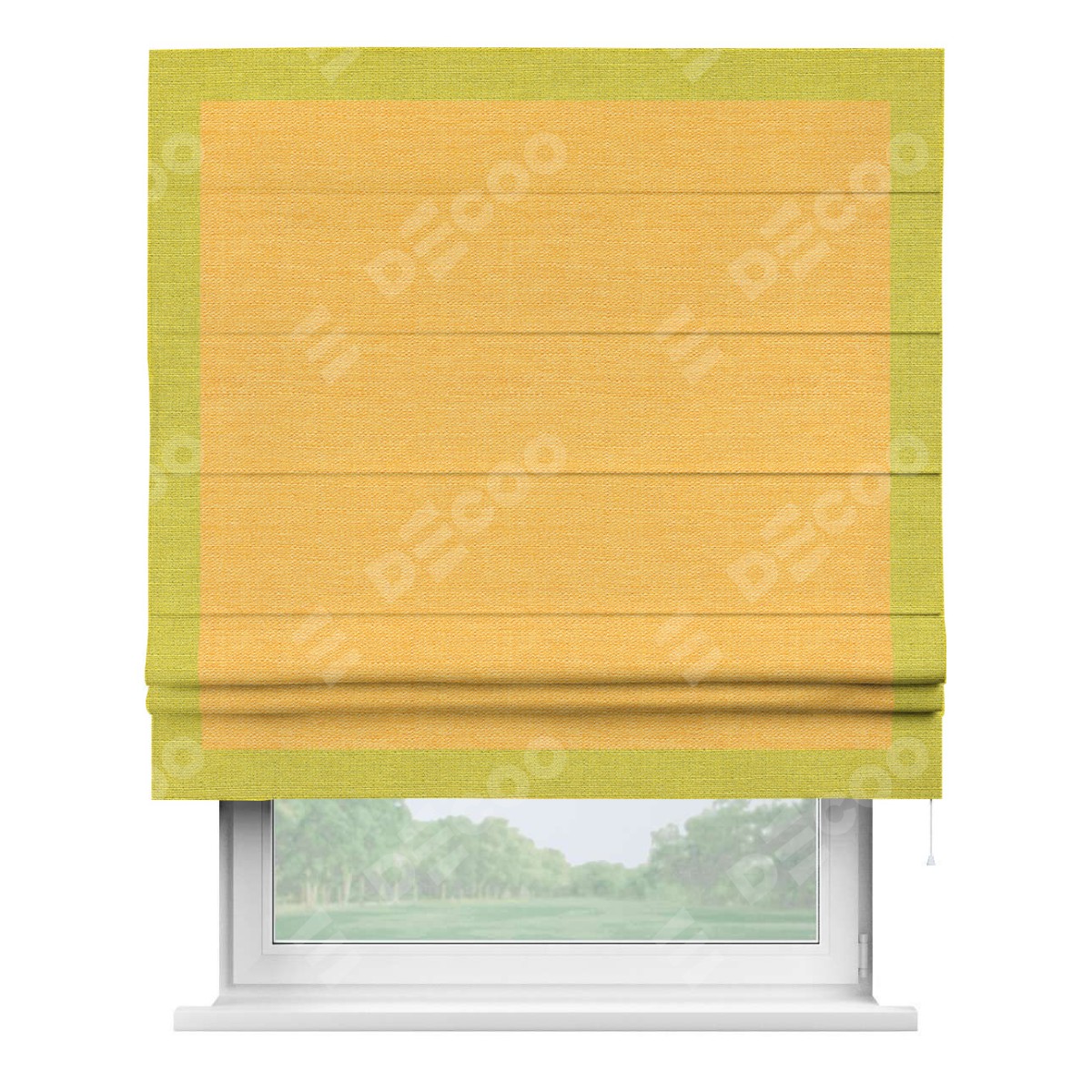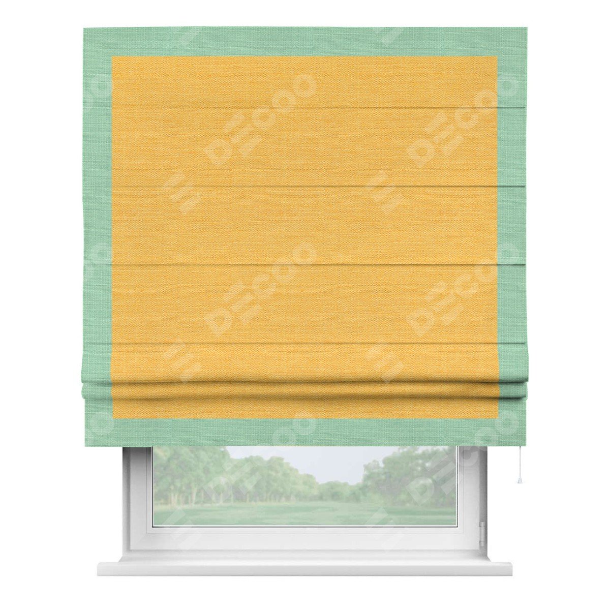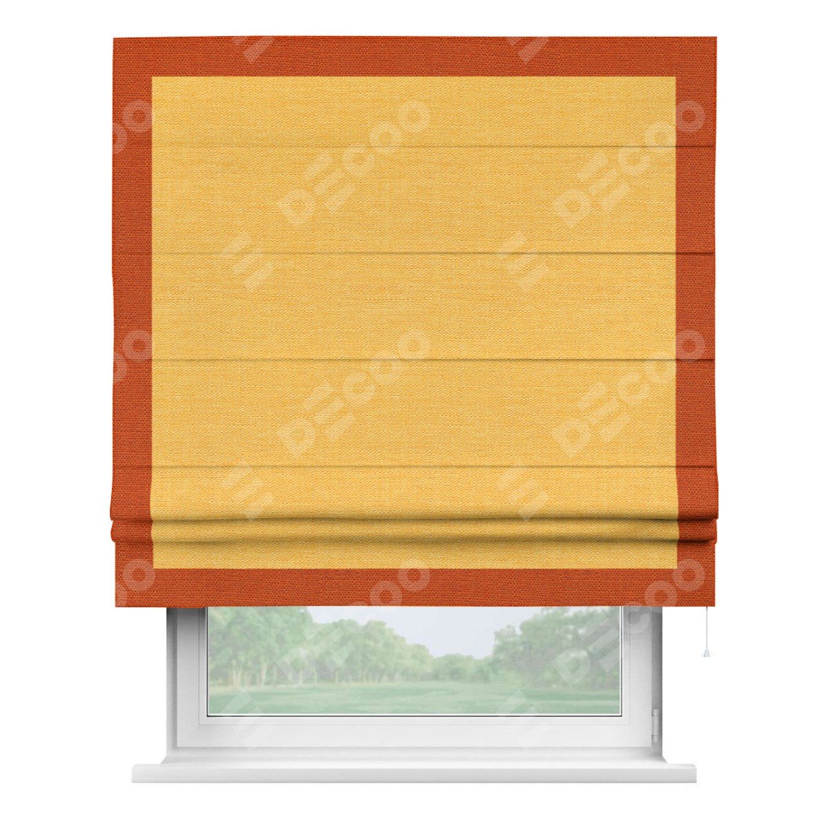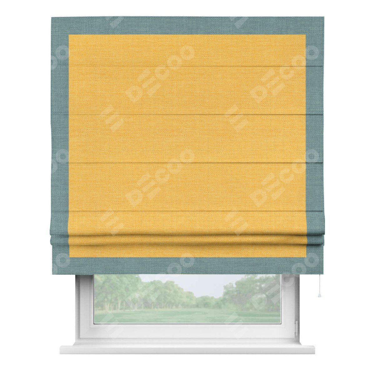 Римская штора производителя «Cortin», используется для проёма, пошита из ткани лён желтый, артикул 63738. Отделка шторы кантом «Чесс», ткань для канта используется из льна разной расцветки на выбор. Имеет универсальный механизм и подходит для монтажа: на потолок, на стену и в нишу.