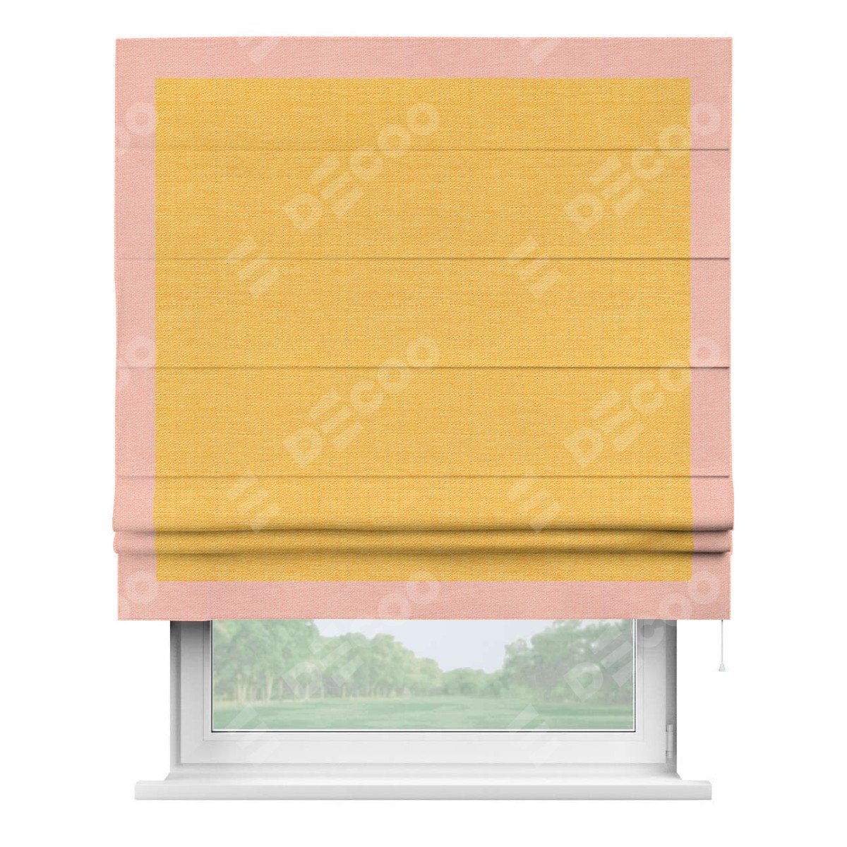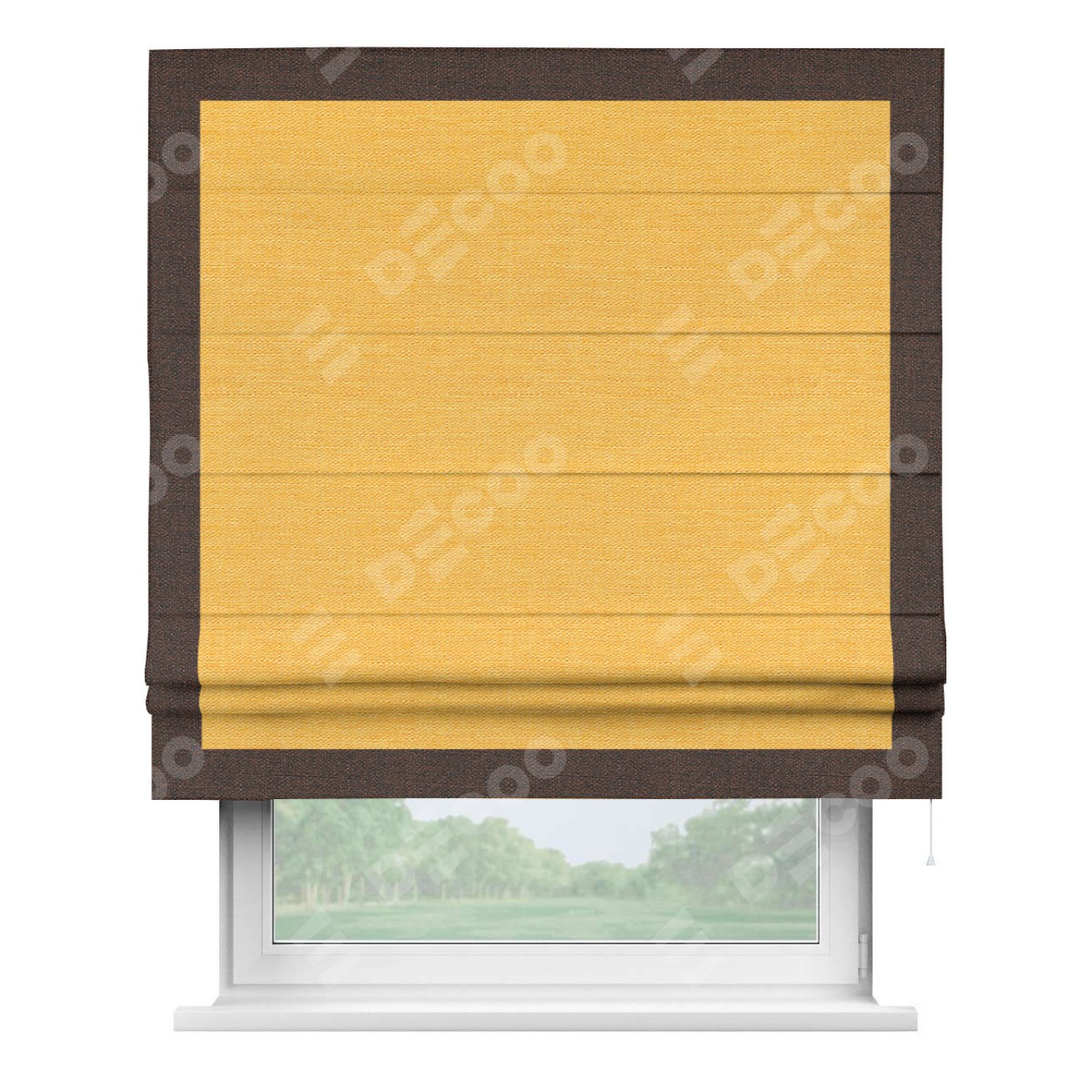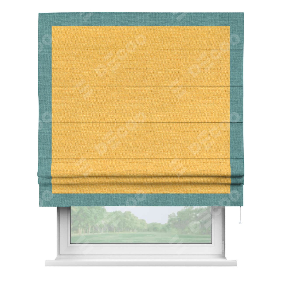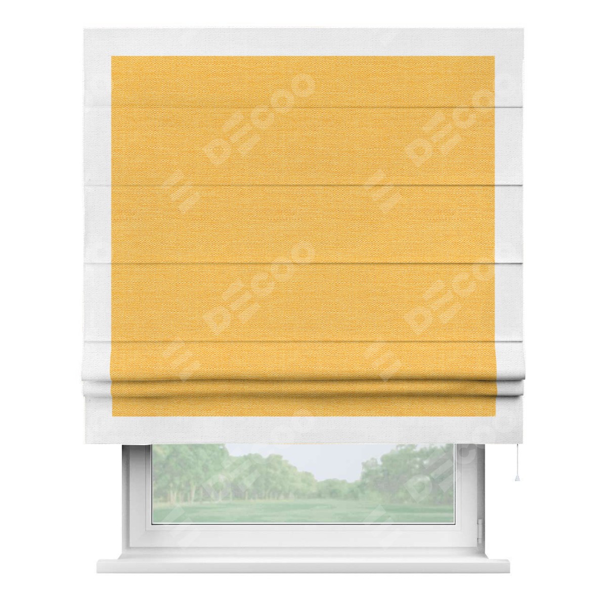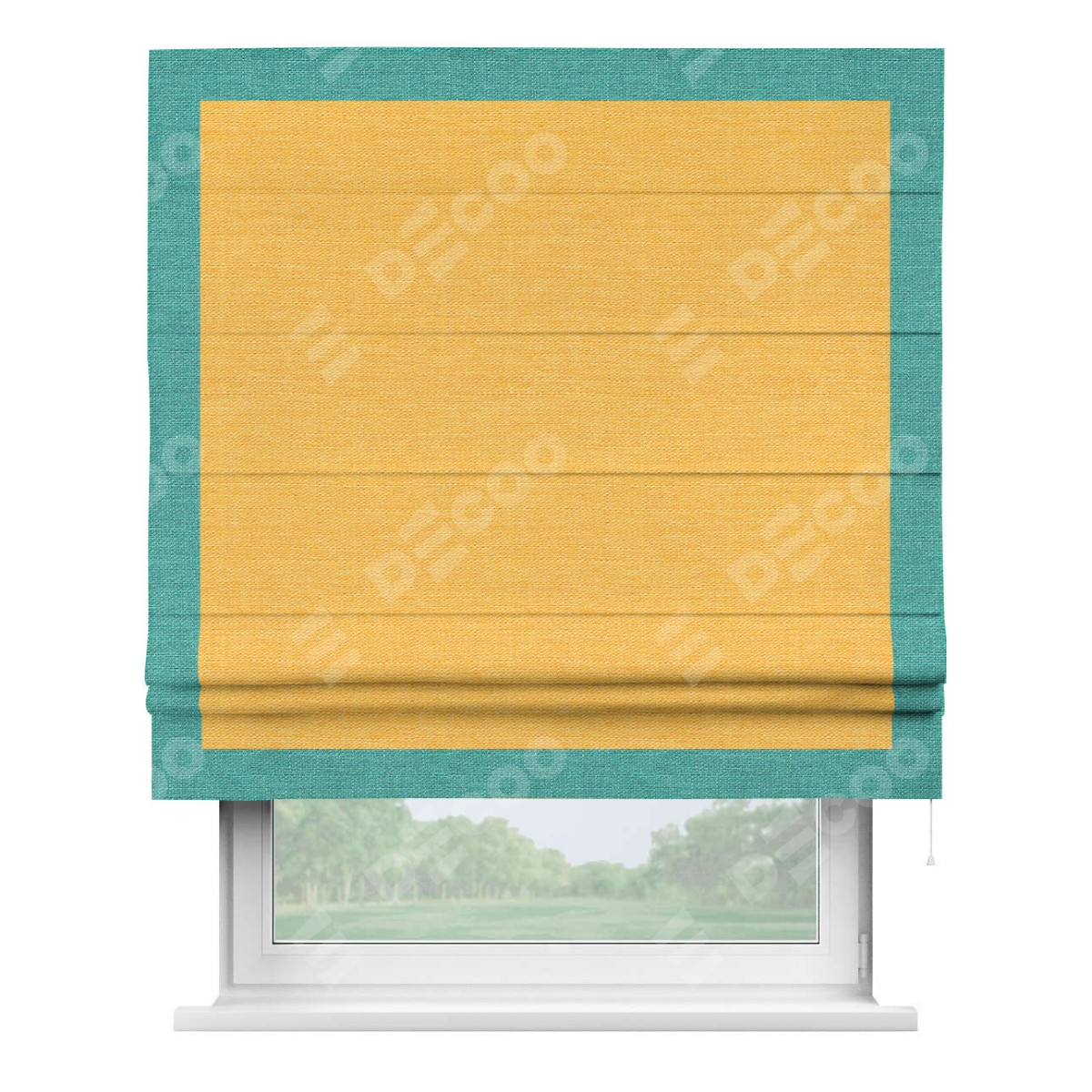Римская штора производителя «Cortin», используется для проёма, пошита из ткани лён желтый, артикул 63738. Отделка шторы кантом «Чесс», ткань для канта используется из льна разной расцветки на выбор. Имеет универсальный механизм и подходит для монтажа: на потолок, на стену и в нишу.