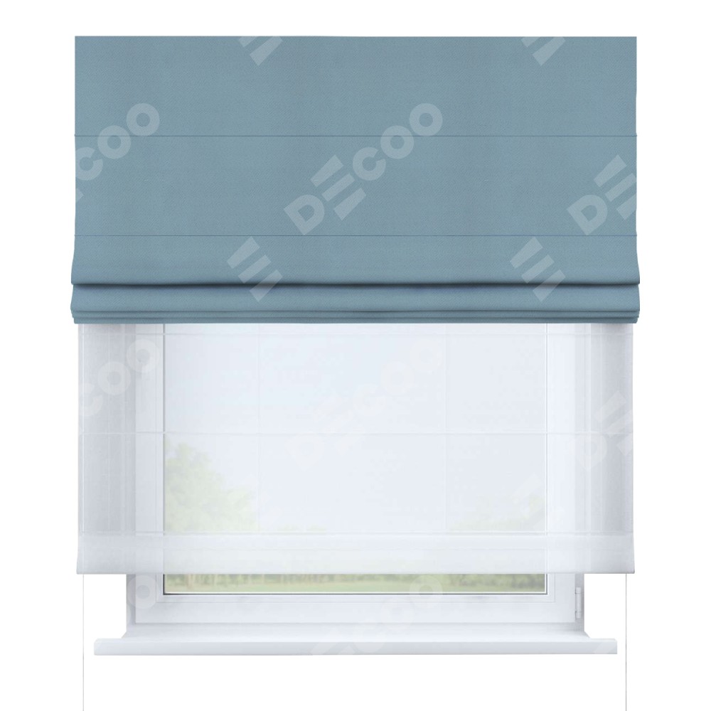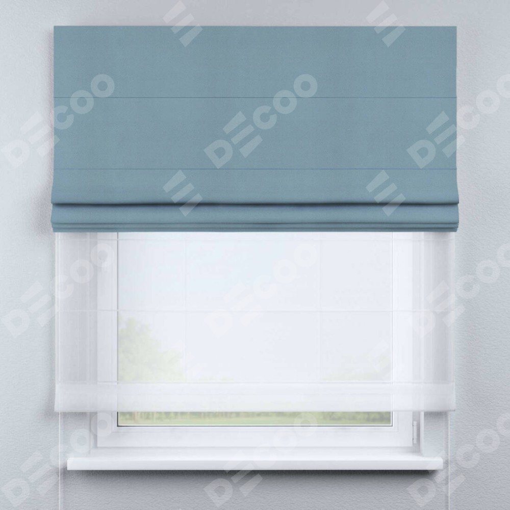Римская штора день-ночь производителя «Cortin», используется для проёма, пошита из двух полотен, с лицевой стороны блэкаут однотонный серо-голубой артикул 29327, вторая ткань тюль (по стандарту комплектуется тюль белого цвета артикул V-01). Имеет универсальный механизм и подходит для монтажа: на потолок, на стену и в нишу.