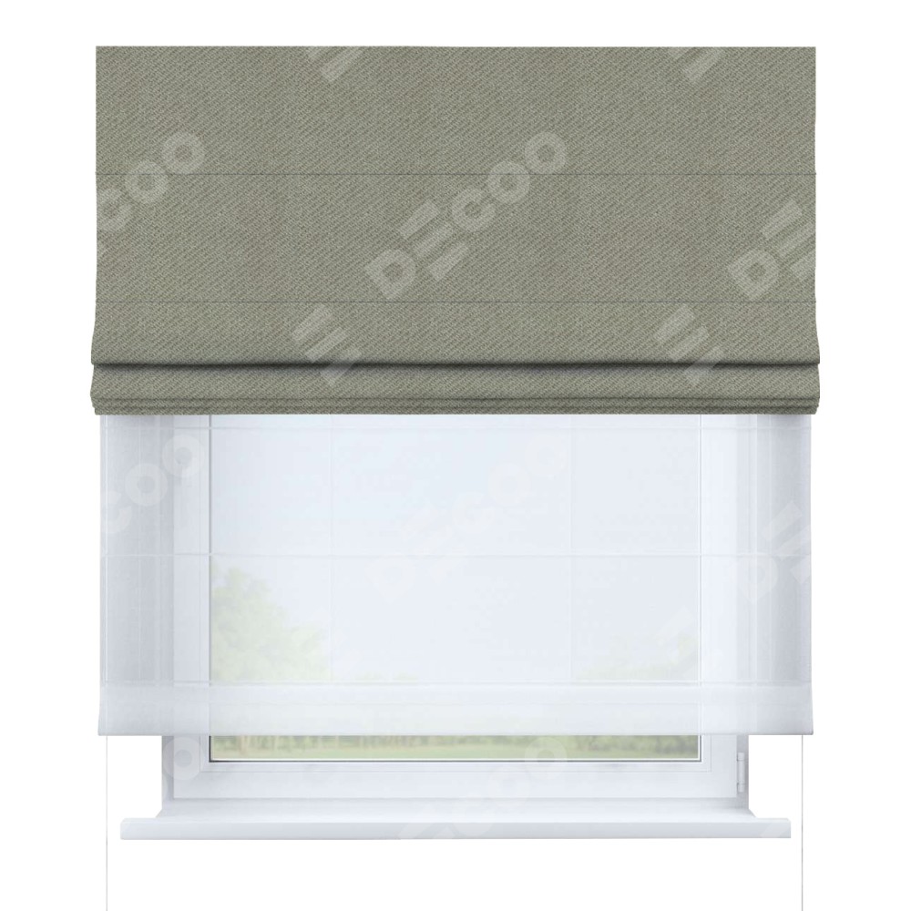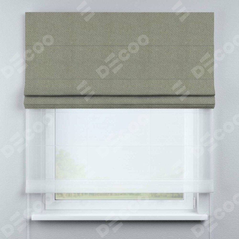 Римская штора день-ночь производителя «Cortin», используется для проёма, пошита из двух полотен, с лицевой стороны твид кофейный артикул 26412, вторая ткань тюль (по стандарту комплектуется тюль белого цвета артикул V-01). Имеет универсальный механизм и подходит для монтажа: на потолок, на стену и в нишу.
