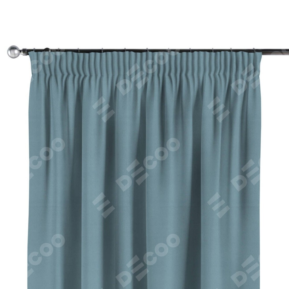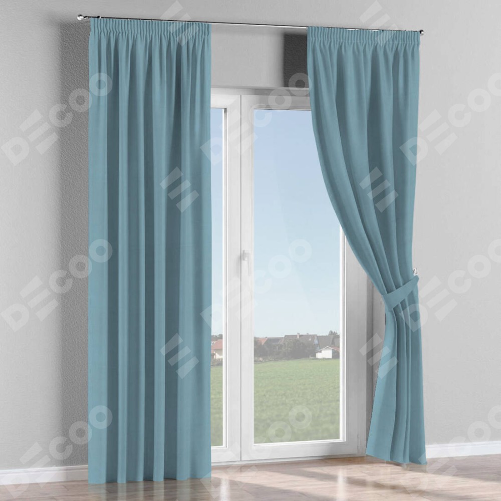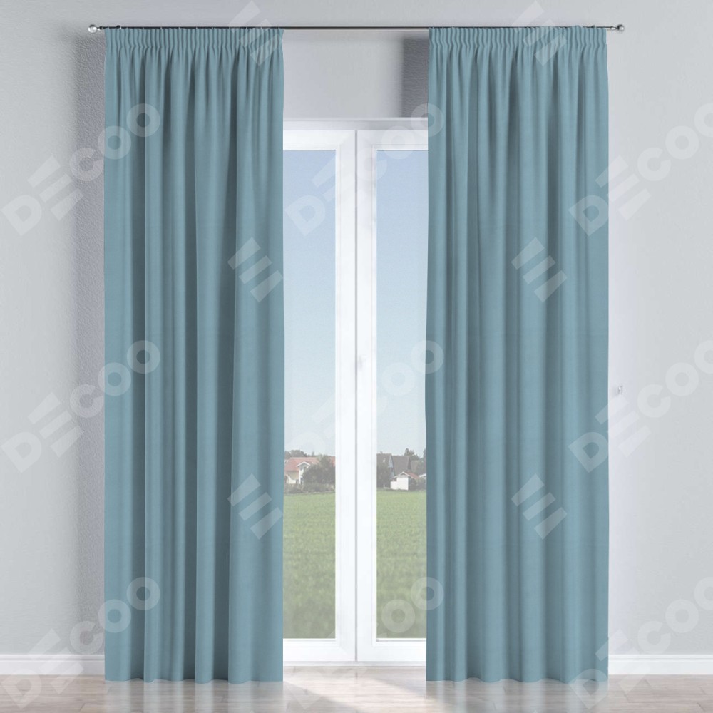Комплект прямых штор, от производителя «Cortin», пошиты из ткани блэкаут однотонный серо-голубой, артикул ткани 29327. С изнаночной стороны в верхней части штор пристрачивается шторная лента с декоративными складками «Карандаш». Для создания элегантных складок прямые шторы шьются по стандарту с коэффициентом 1:2 (на 100 см. ширины проёма 200 см. ширины ткани).