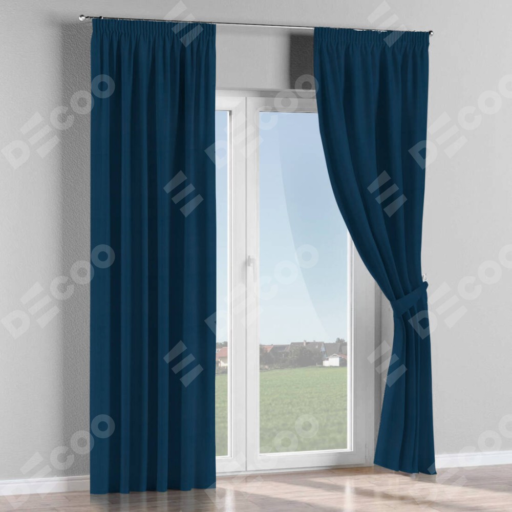 Комплект прямых штор, от производителя «Cortin», пошиты из ткани блэкаут однотонный синий, артикул ткани 29327. С изнаночной стороны в верхней части штор пристрачивается шторная лента с декоративными складками «Карандаш». Для создания элегантных складок прямые шторы шьются по стандарту с коэффициентом 1:2 (на 100 см. ширины проёма 200 см. ширины ткани).