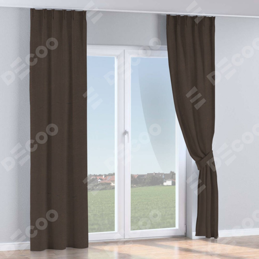 Комплект прямых штор, от производителя «Cortin», пошиты из ткани лён димаут венге, артикул ткани 85410. С изнаночной стороны в верхней части штор пристрачивается шторная лента с декоративными складками «Кустик». Для создания элегантных складок прямые шторы шьются по стандарту с коэффициентом 1:2 (на 100 см. ширины проёма 200 см. ширины ткани).