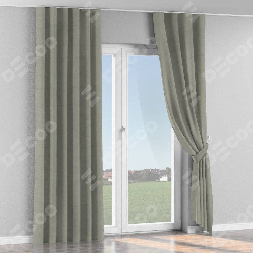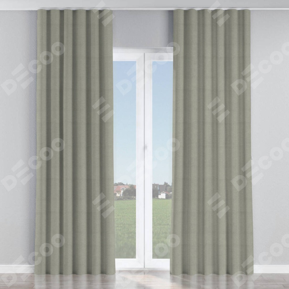 Комплект прямых штор, от производителя «Cortin», пошиты из ткани лён димаут серый, артикул ткани 00001. С изнаночной стороны в верхней части штор пристрачивается шторная лента с декоративными складками «Волна». Для создания элегантных складок прямые шторы шьются по стандарту с коэффициентом 1:2 (на 100 см. ширины проёма 200 см. ширины ткани).