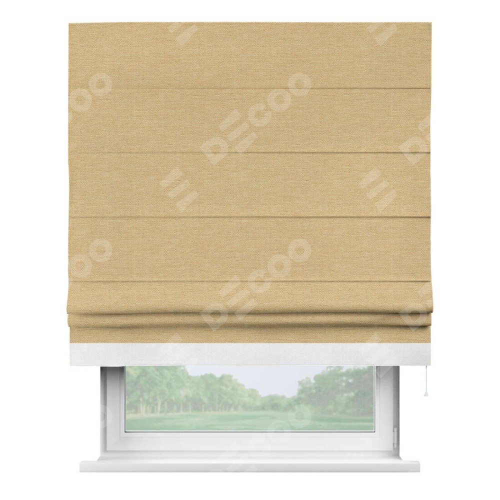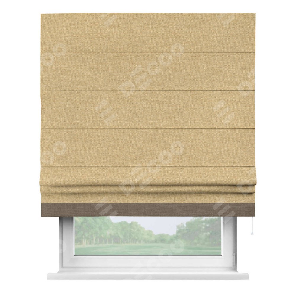 Римская штора производителя «Cortin», используется для проёма, пошита из ткани лён темно-бежевый, артикул 53433. Отделка шторы кантом «Джестер», ткань для канта используется из льна разной расцветки на выбор. Имеет универсальный механизм и подходит для монтажа: на потолок, на стену и в нишу.