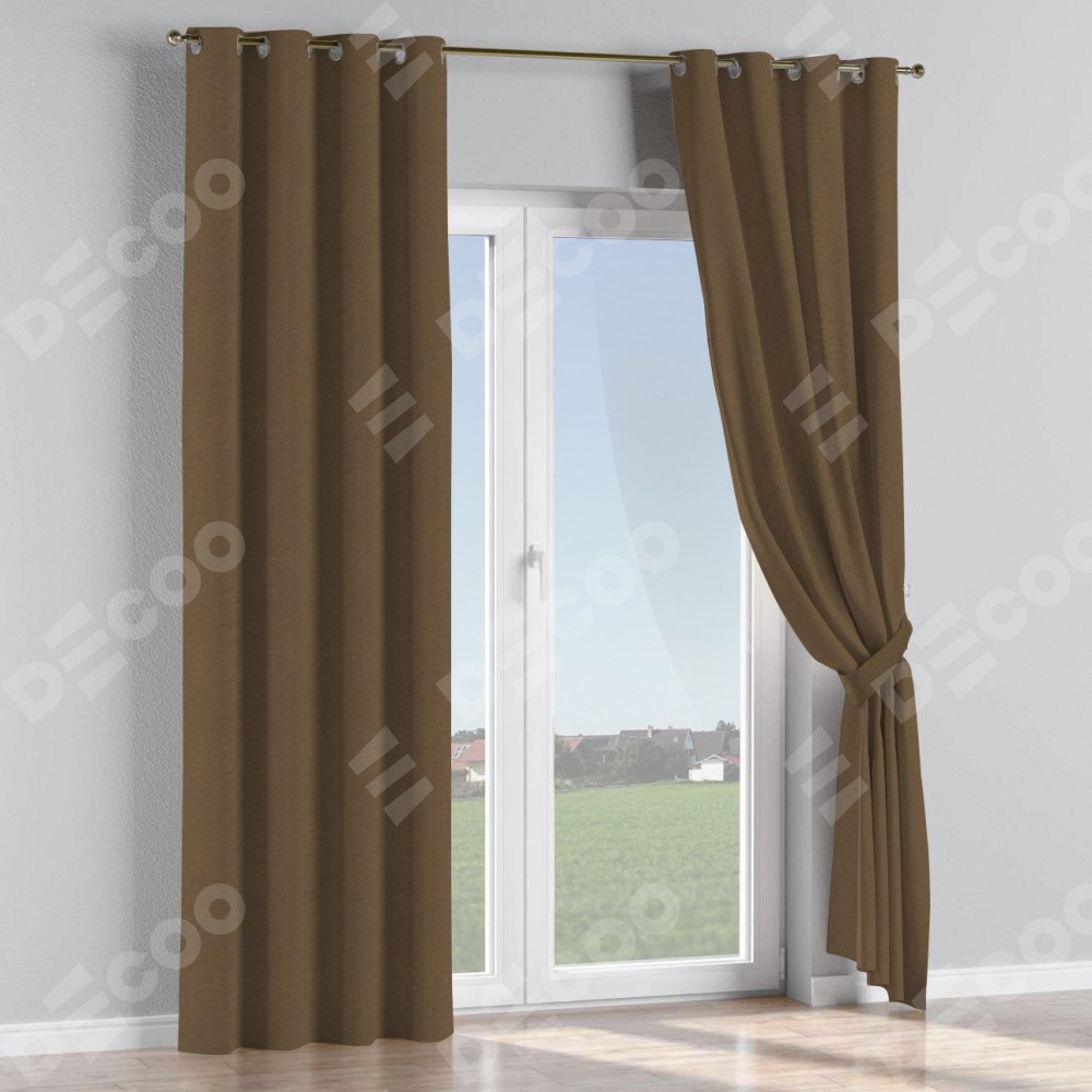 Комплект прямых штор, от производителя «Cortin», пошиты из ткани лён димаут тёмно-коричневый, артикул ткани 83030. Данная модель пошита на люверсах, комплектуется на выбор круглым карнизом и подходит для монтажа на стену или потолок. Прямые шторы на люверсах шьются по стандарту с коэффициентом 1/2 (на 100 см. ширины проёма 200 см. ширины ткани), отличительным преимуществом данной модели является простой способ монтажа. Достаточно повесить ее на трубу и штора готова!