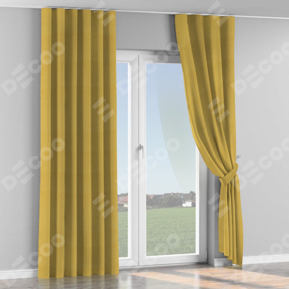 Комплект прямых штор, от производителя «Cortin», пошиты из ткани твид блэкаут пыльная горчица, артикул ткани 21588. С изнаночной стороны в верхней части штор пристрачивается шторная лента с декоративными складками «Волна». Для создания элегантных складок прямые шторы шьются по стандарту с коэффициентом 1:2 (на 100 см. ширины проёма 200 см. ширины ткани).