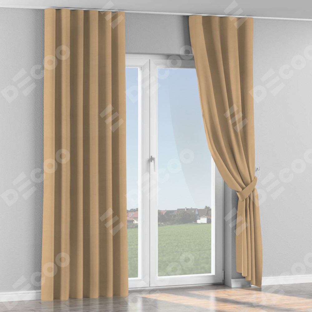 Комплект прямых штор, от производителя «Cortin», пошиты из ткани вельвет песочный, артикул ткани 17740. С изнаночной стороны в верхней части штор пристрачивается шторная лента с декоративными складками «Волна». Для создания элегантных складок прямые шторы шьются по стандарту с коэффициентом 1:2 (на 100 см. ширины проёма 200 см. ширины ткани).