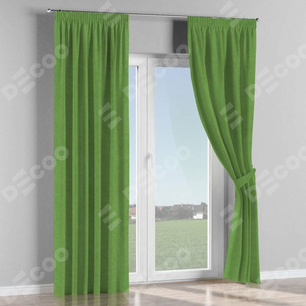Комплект прямых штор, от производителя «Cortin», пошиты из ткани вельвет салатовый, артикул ткани 87072. С изнаночной стороны в верхней части штор пристрачивается шторная лента с декоративными складками «Карандаш». Для создания элегантных складок прямые шторы шьются по стандарту с коэффициентом 1:2 (на 100 см. ширины проёма 200 см. ширины ткани).