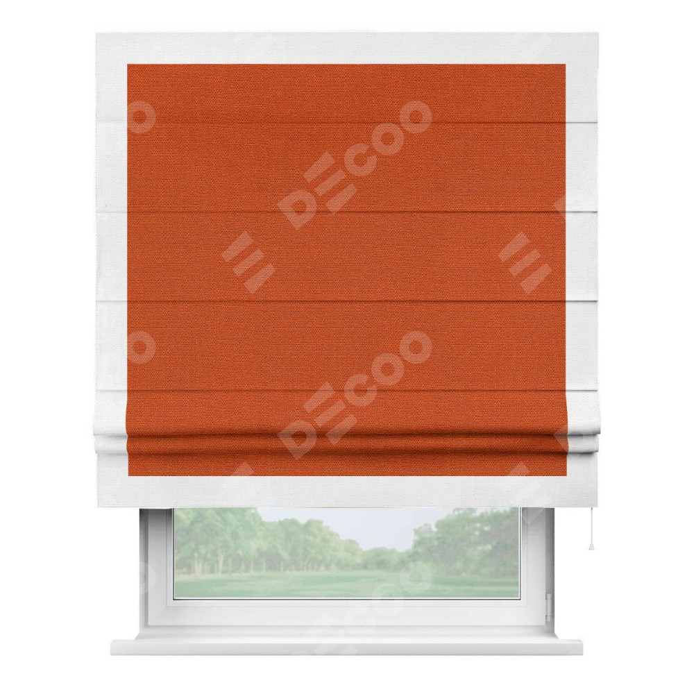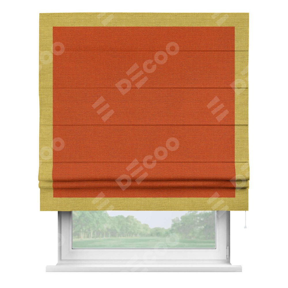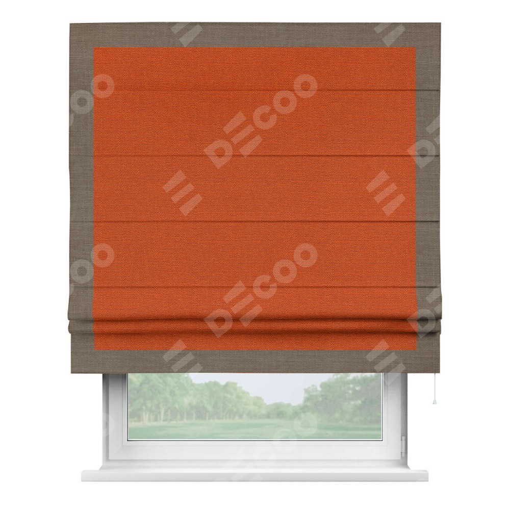 Римская штора производителя «Cortin», используется для проёма, пошита из ткани лён терракотовый, артикул 53440. Отделка шторы кантом «Чесс», ткань для канта используется из льна разной расцветки на выбор. Имеет универсальный механизм и подходит для монтажа: на потолок, на стену и в нишу.