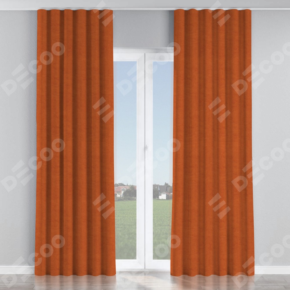 Комплект прямых штор, от производителя «Cortin», пошиты из ткани вельвет терракотовый, артикул ткани 85548. С изнаночной стороны в верхней части штор пристрачивается шторная лента с декоративными складками «Волна». Для создания элегантных складок прямые шторы шьются по стандарту с коэффициентом 1:2 (на 100 см. ширины проёма 200 см. ширины ткани).