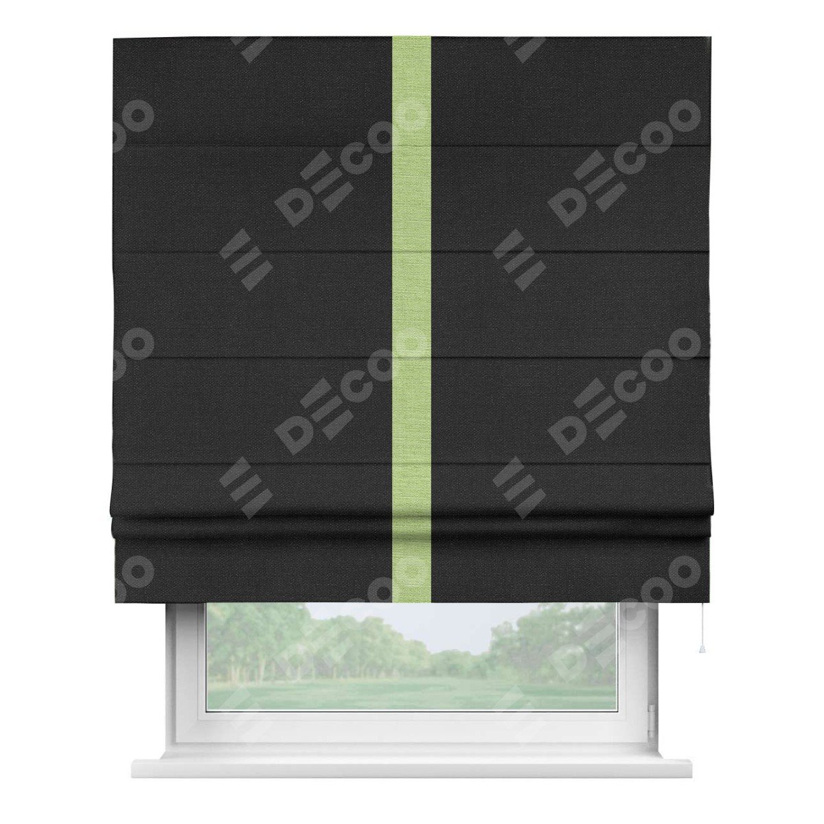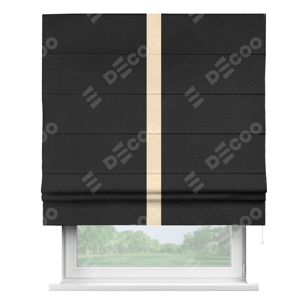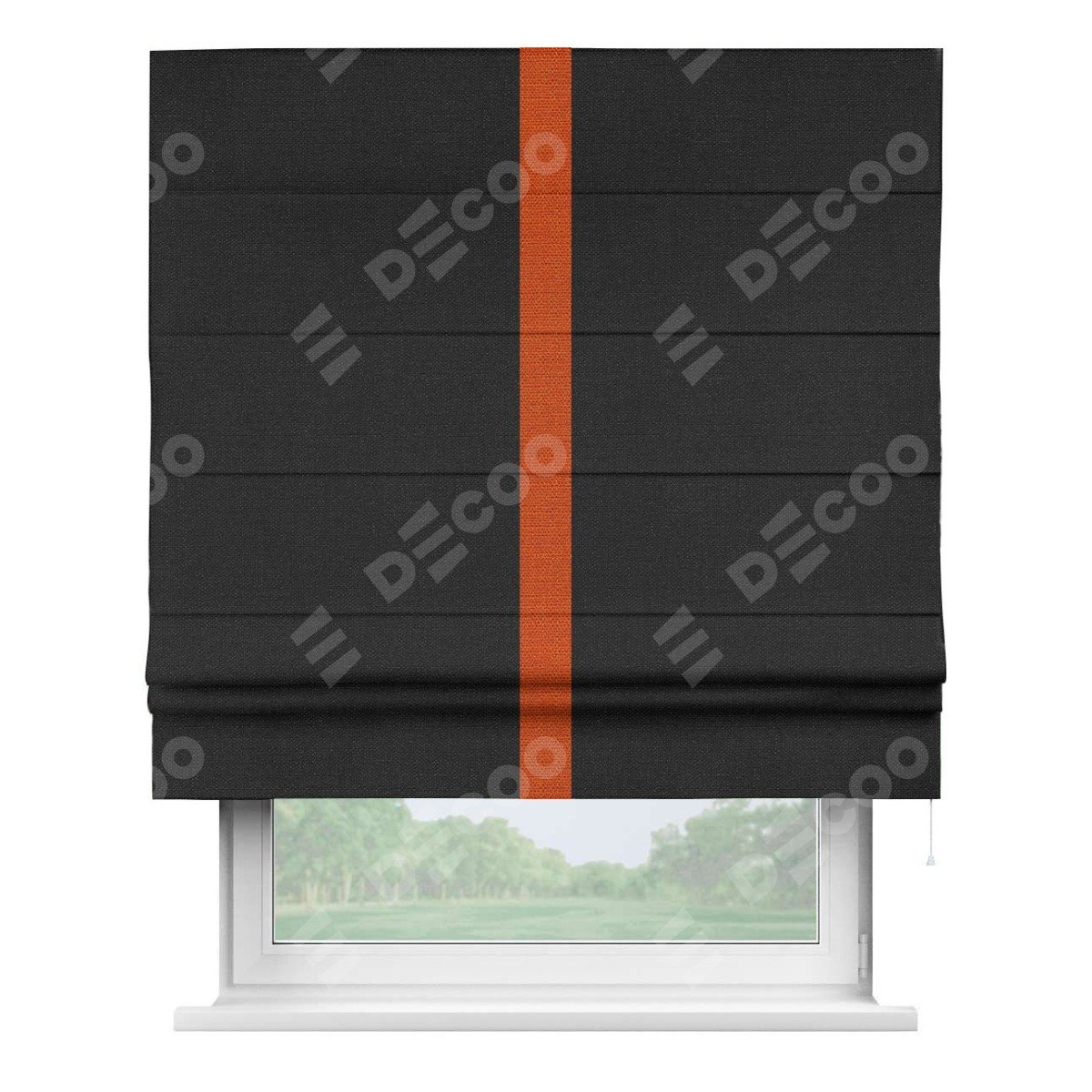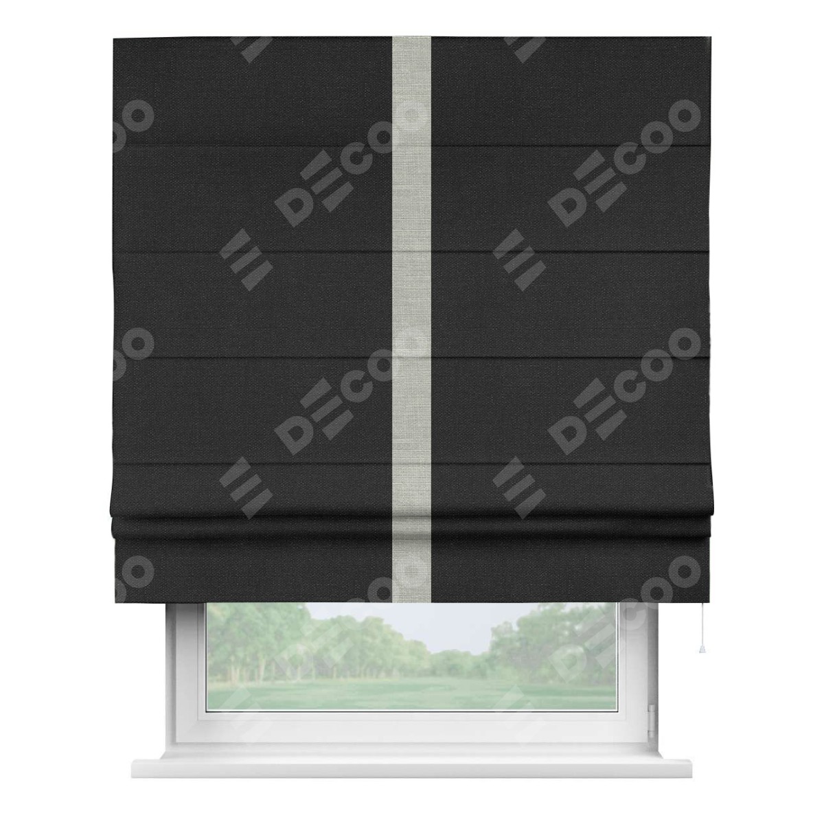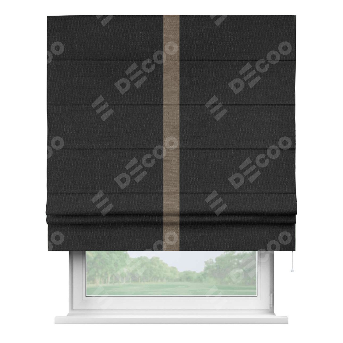 Римская штора производителя «Cortin», используется для проёма, пошита из ткани лён черный, артикул 85927. Отделка шторы кантом «Хайвэй», ткань для канта используется из льна разной расцветки на выбор. Имеет универсальный механизм и подходит для монтажа: на потолок, на стену и в нишу.