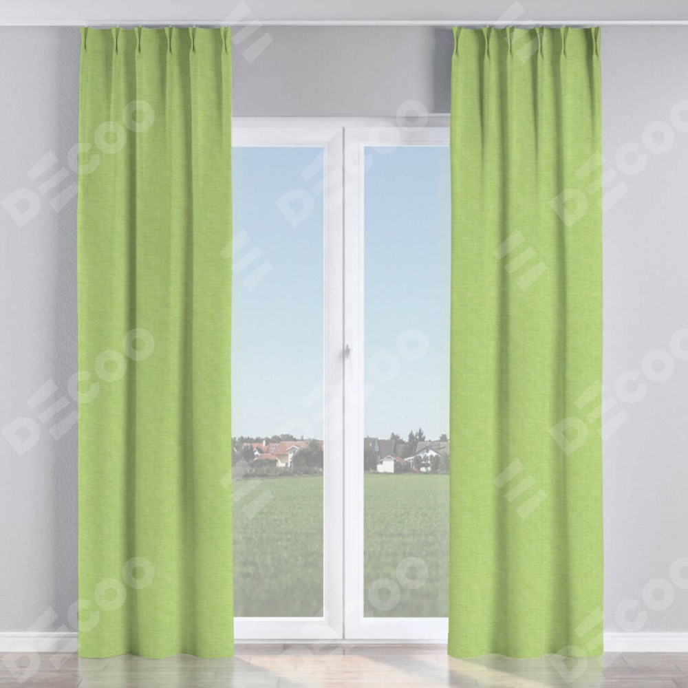 Комплект прямых штор, от производителя «Cortin», пошиты из ткани лён зелёный, артикул ткани 85906. С изнаночной стороны в верхней части штор пристрачивается шторная лента с декоративными складками «Кустик». Для создания элегантных складок прямые шторы шьются по стандарту с коэффициентом 1:2 (на 100 см. ширины проёма 200 см. ширины ткани).