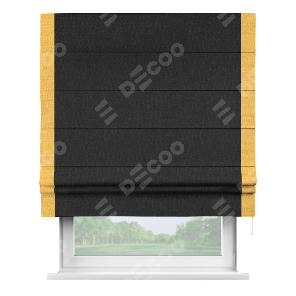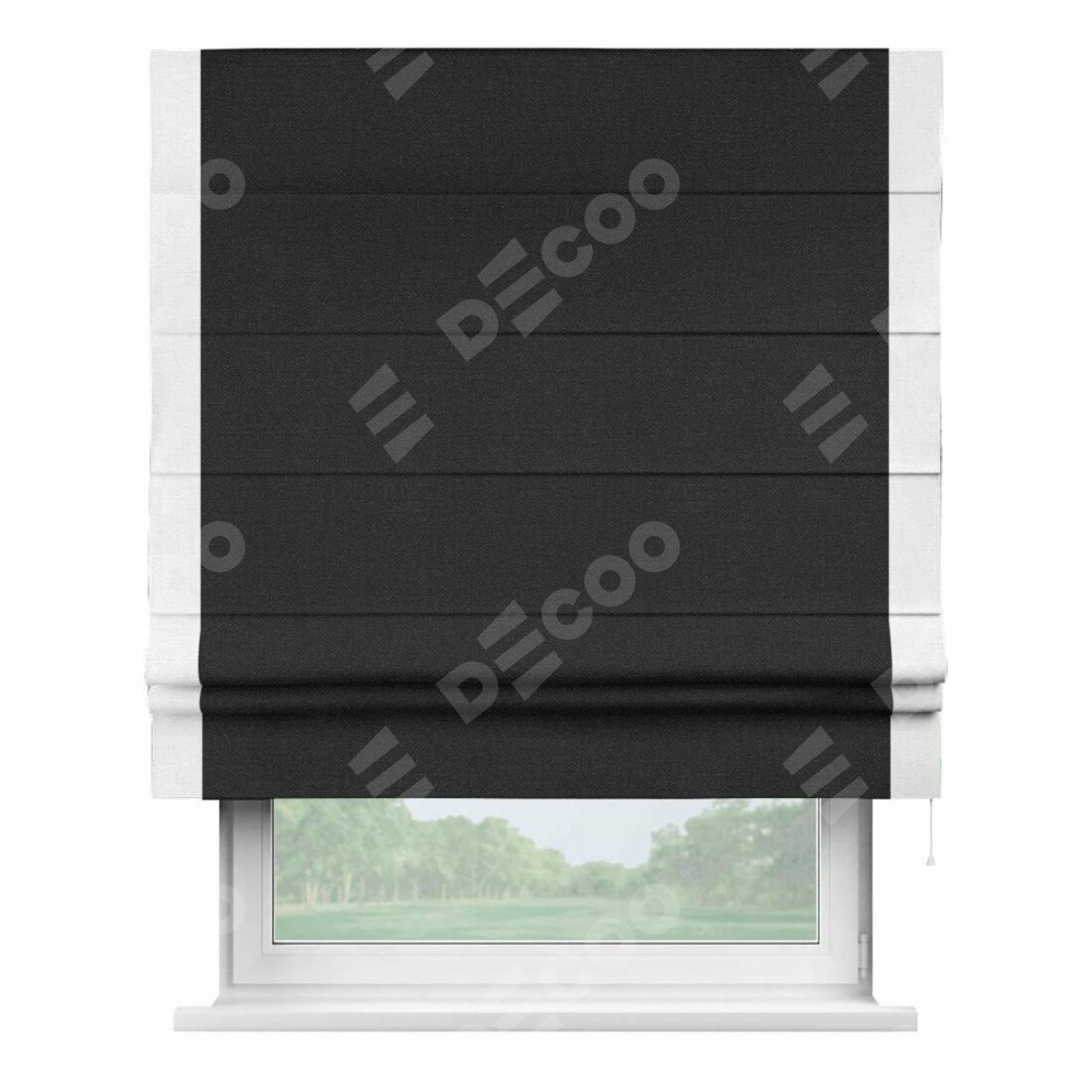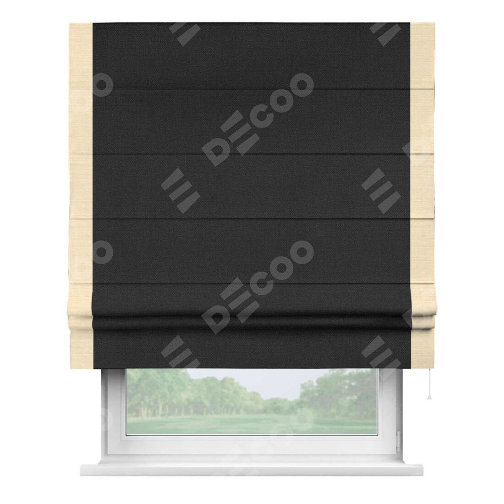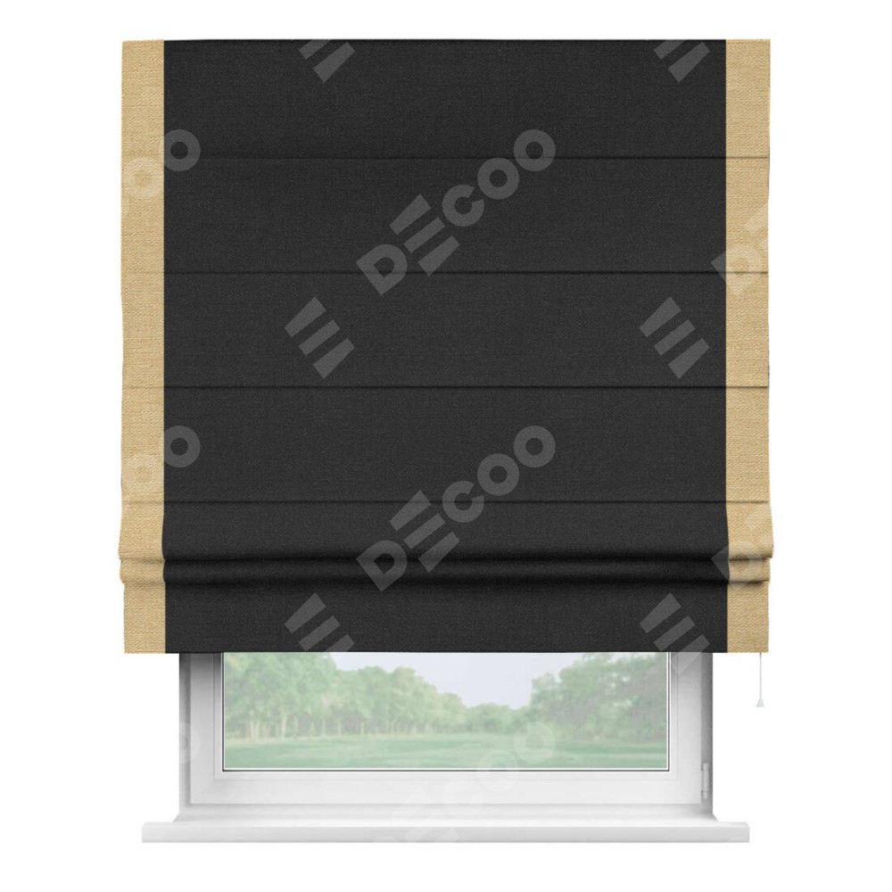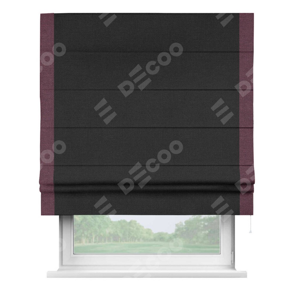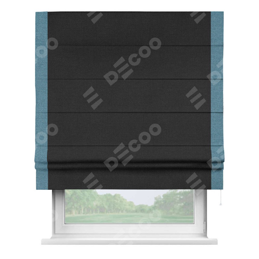 Римская штора производителя «Cortin», используется для проёма, пошита из ткани лён черный, артикул 85927. Отделка шторы кантом Стрим Дуо», ткань для канта используется из льна разной расцветки на выбор. Имеет универсальный механизм и подходит для монтажа: на потолок, на стену и в нишу.