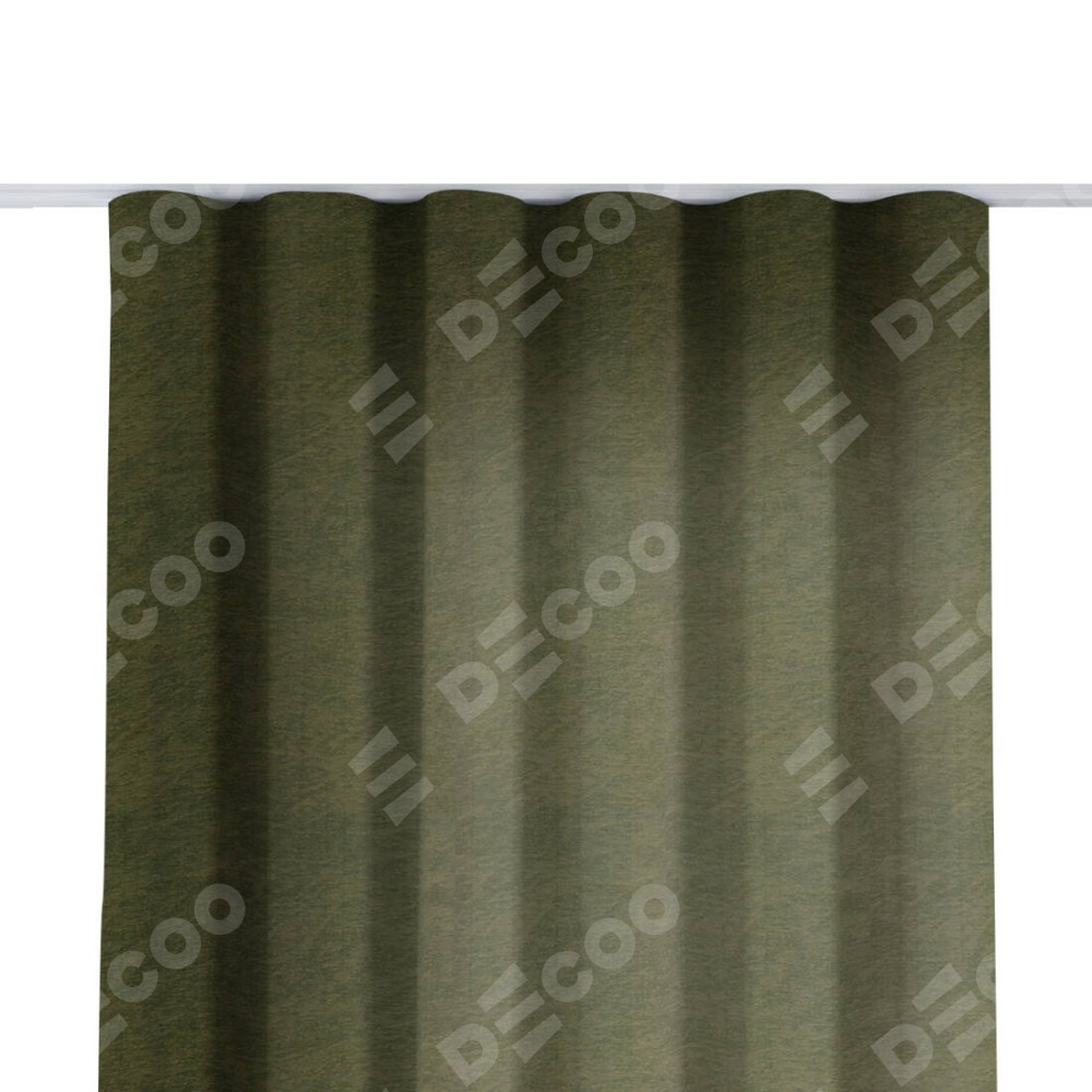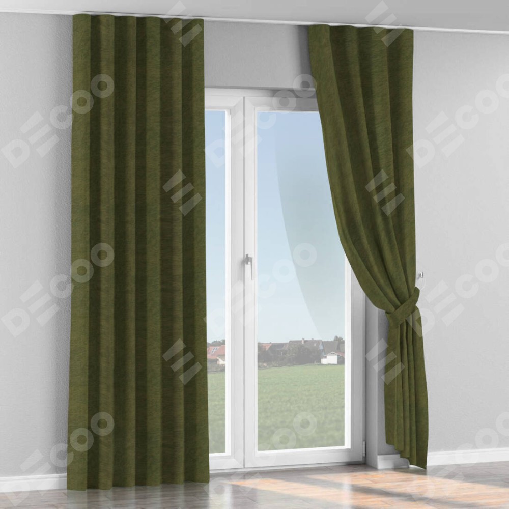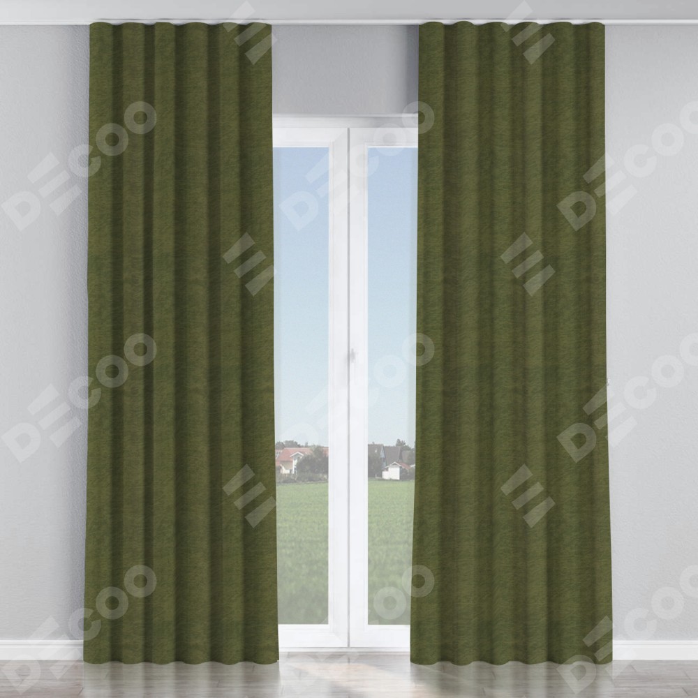 Комплект прямых штор, от производителя «Cortin», пошиты из ткани софт однотонный зелёный, артикул ткани 33110. С изнаночной стороны в верхней части штор пристрачивается шторная лента с декоративными складками «Волна». Для создания элегантных складок прямые шторы шьются по стандарту с коэффициентом 1:2 (на 100 см. ширины проёма 200 см. ширины ткани).