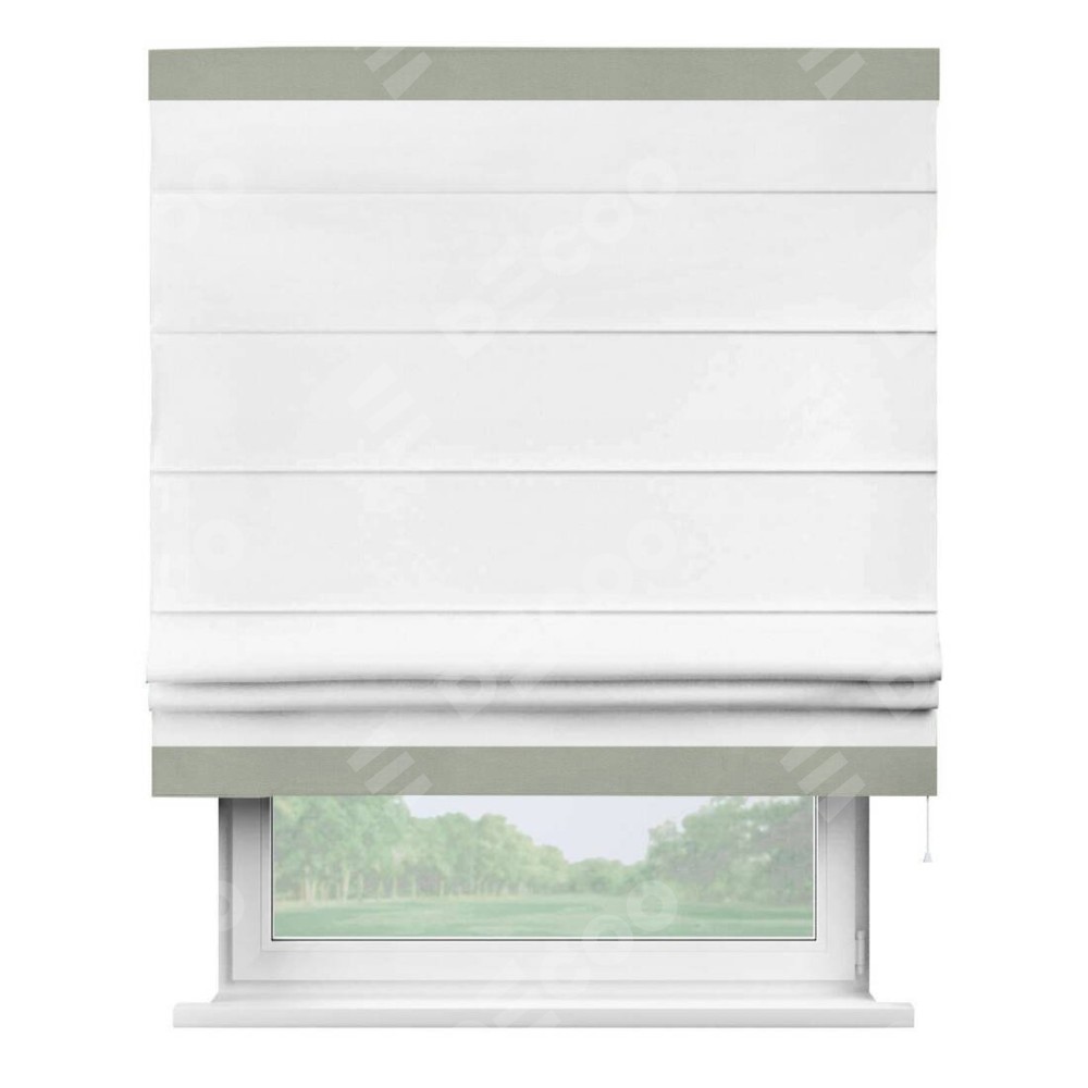 Римская штора производителя «Cortin», используется для проёма, пошита из ткани вельвет белый, артикул ткани 10810. Отделка шторы кантом «Горизонт», ткань для канта используется из вельвета разной расцветки на выбор. Имеет универсальный механизм и подходит для монтажа: на потолок, на стену и в нишу.