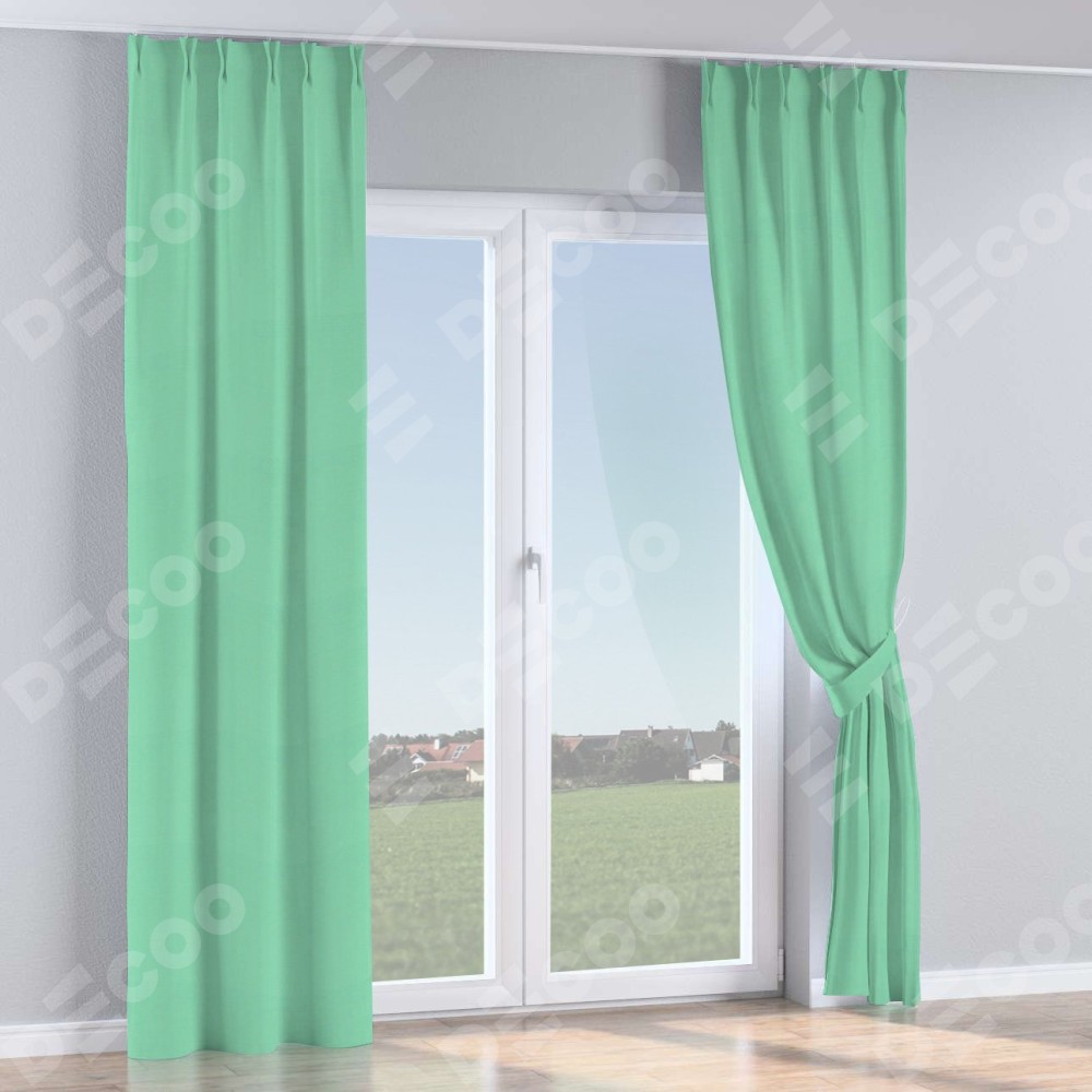 Комплект прямых штор, от производителя «Cortin», пошиты из ткани pipa блэкаут бирюза, артикул ткани 81852. С изнаночной стороны в верхней части штор пристрачивается шторная лента с декоративными складками «Кустик». Для создания элегантных складок прямые шторы шьются по стандарту с коэффициентом 1:2 (на 100 см. ширины проёма 200 см. ширины ткани).
