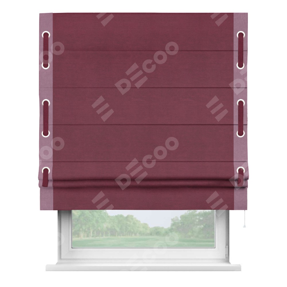 Римская штора производителя «Cortin», используется для проёма, пошита из ткани вельвет бордовый, артикул ткани 85553. Отделка шторы кантом «Стрим Дуо» на кантах расположены люверсы с пояском, ткань для канта используется из вельвета разной расцветки на выбор. Ткань для пояска обычно используется из основной ткани шторы, а так же можно сделать из любой расцветки по желанию. Имеет универсальный механизм и подходит для монтажа: на потолок, на стену и в нишу.