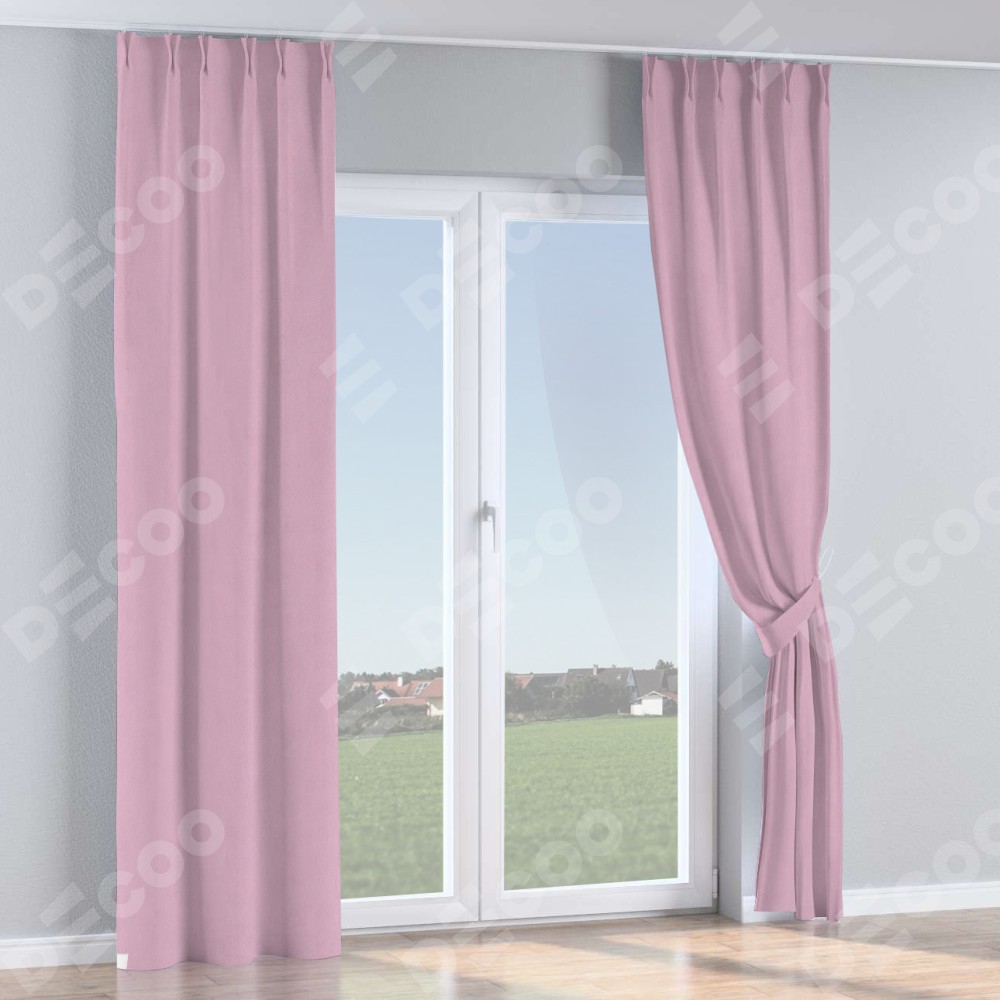 Комплект прямых штор, от производителя «Cortin», пошиты из ткани pipa блэкаут розовый, артикул ткани 12091. С изнаночной стороны в верхней части штор пристрачивается шторная лента с декоративными складками «Кустик». Для создания элегантных складок прямые шторы шьются по стандарту с коэффициентом 1:2 (на 100 см. ширины проёма 200 см. ширины ткани).