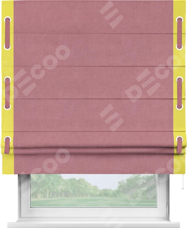 Римская штора производителя «Cortin», используется для проёма, пошита из ткани вельвет брусника, артикул ткани 85550. Отделка шторы кантом «Стрим Дуо» на кантах расположены люверсы с пояском, ткань для канта используется из вельвета разной расцветки на выбор. Ткань для пояска обычно используется из основной ткани шторы, а так же можно сделать из любой расцветки по желанию. Имеет универсальный механизм и подходит для монтажа: на потолок, на стену и в нишу.