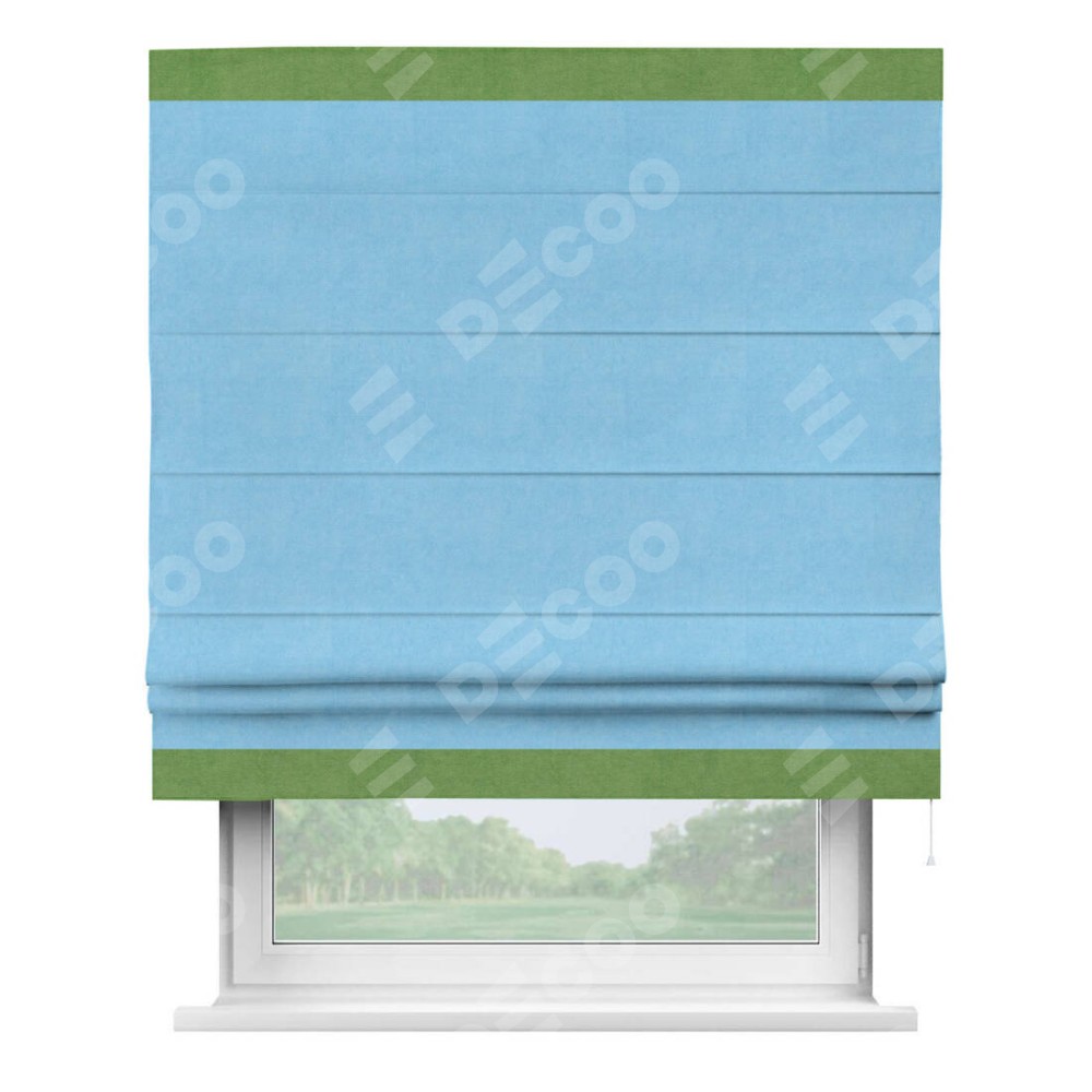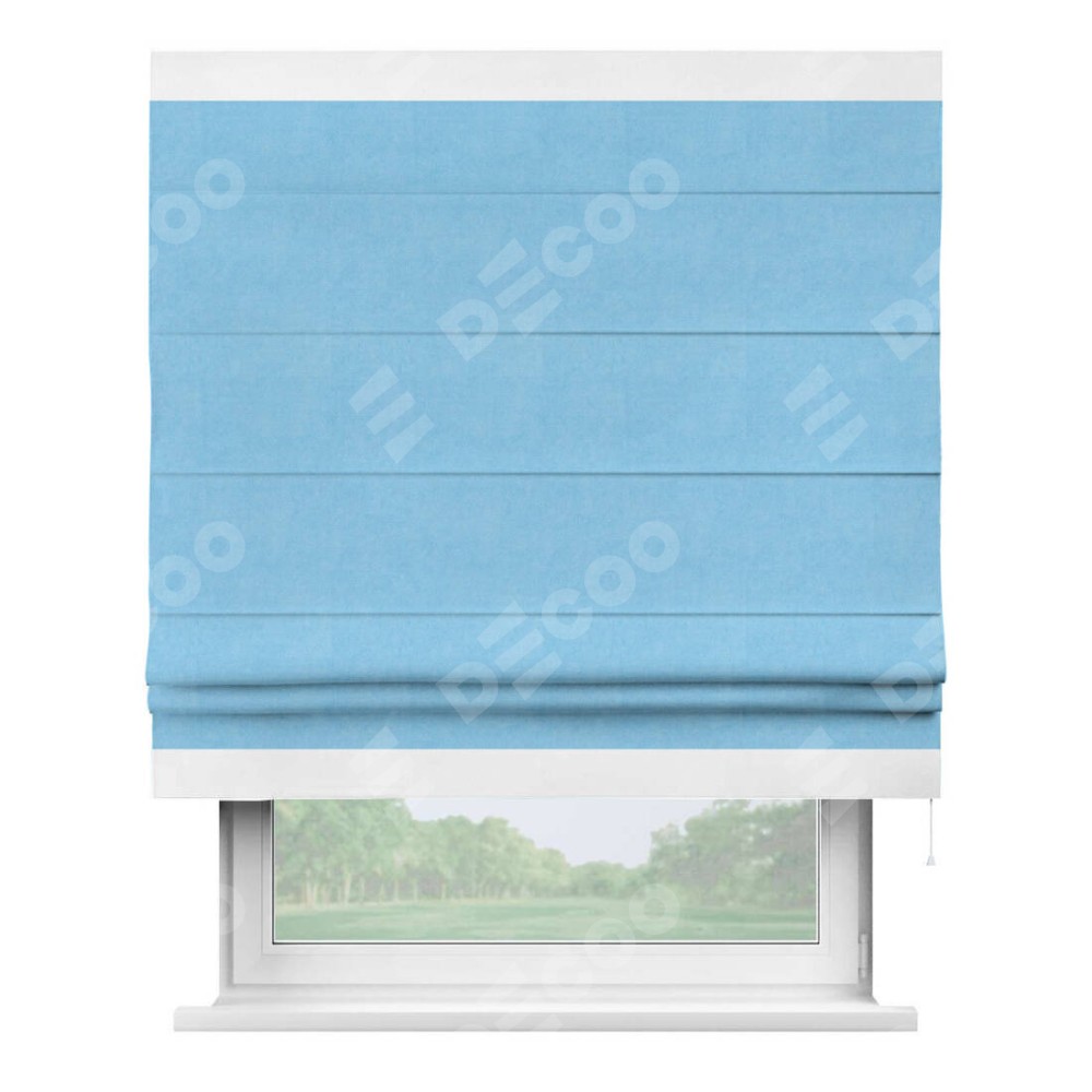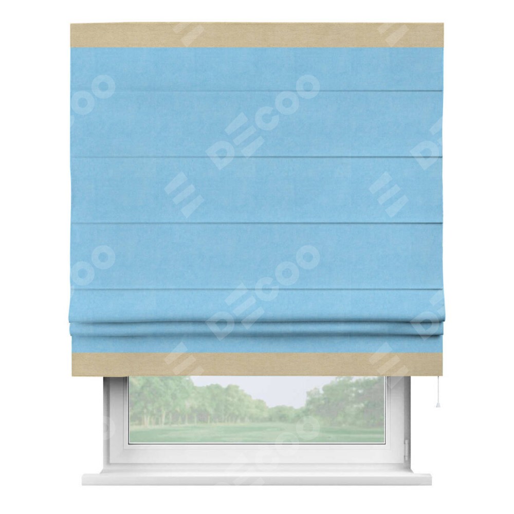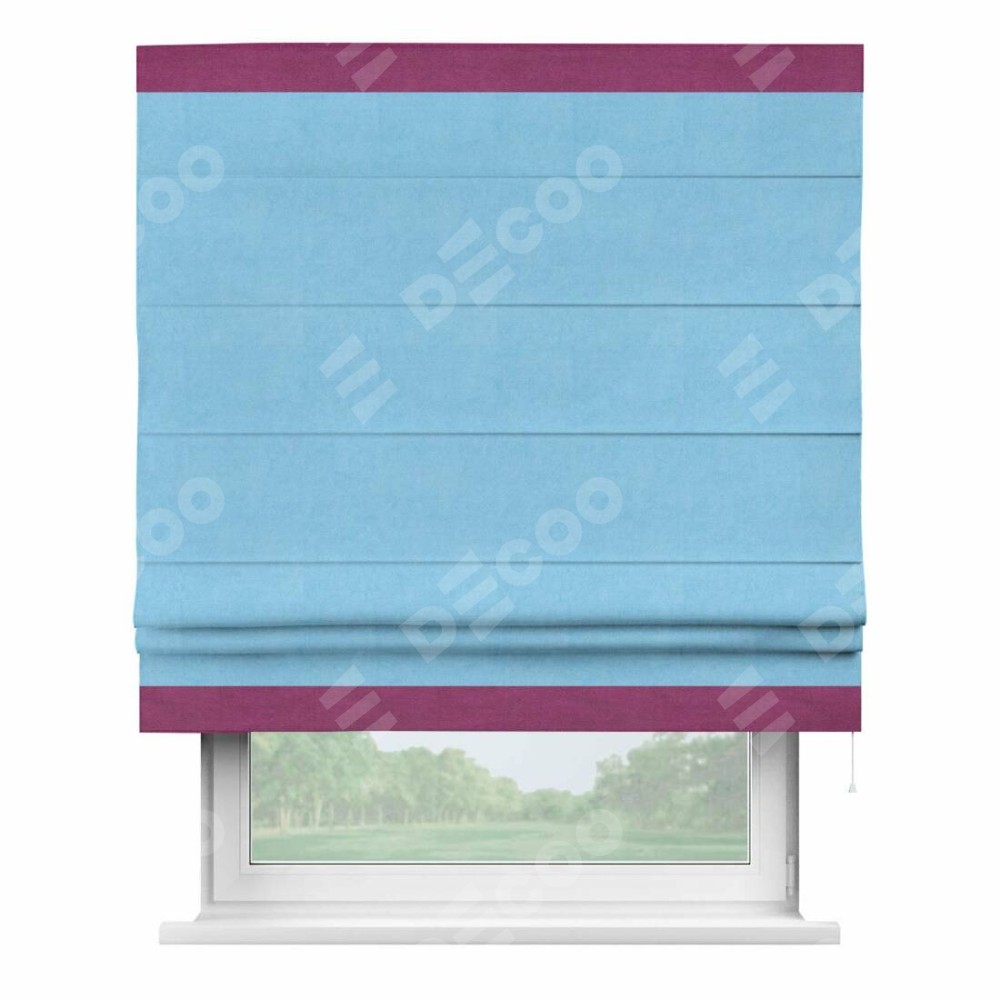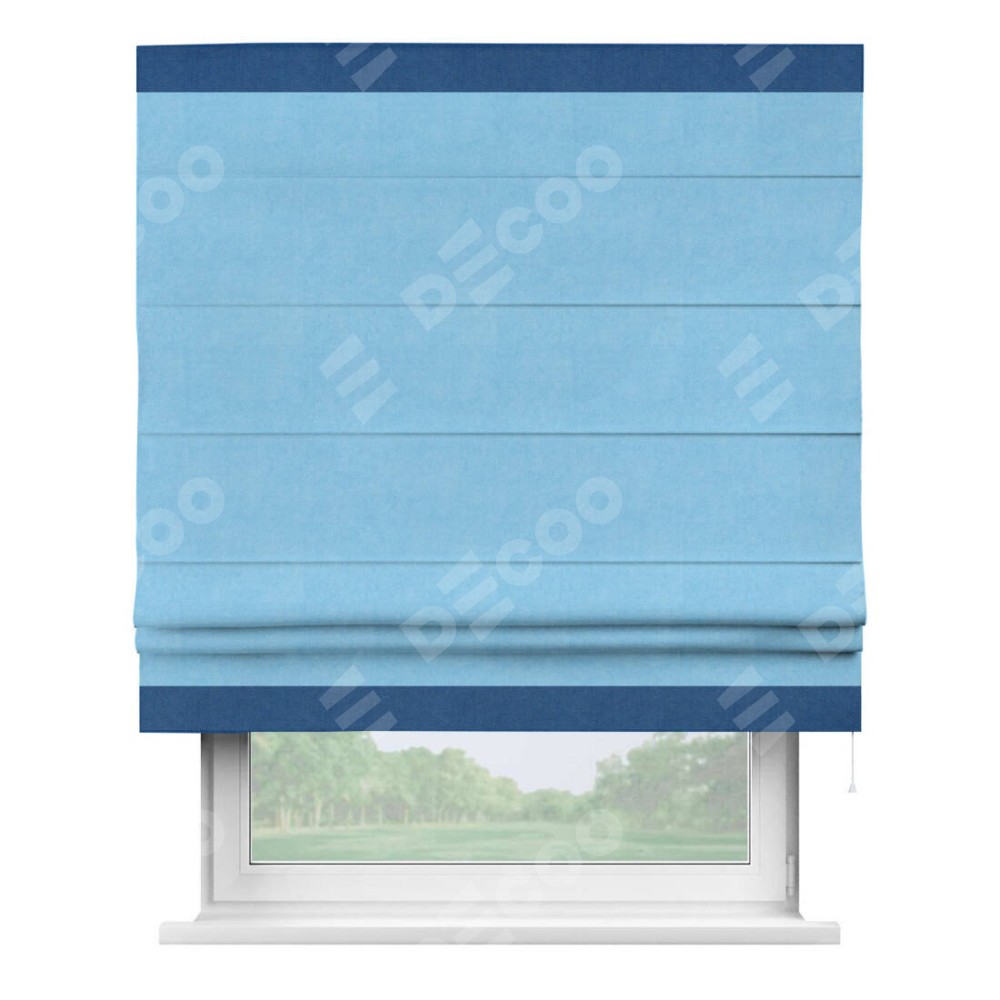 Римская штора производителя «Cortin», используется для проёма, пошита из ткани вельвет голубой, артикул ткани 85544. Отделка шторы кантом «Горизонт», ткань для канта используется из вельвета разной расцветки на выбор. Имеет универсальный механизм и подходит для монтажа: на потолок, на стену и в нишу.