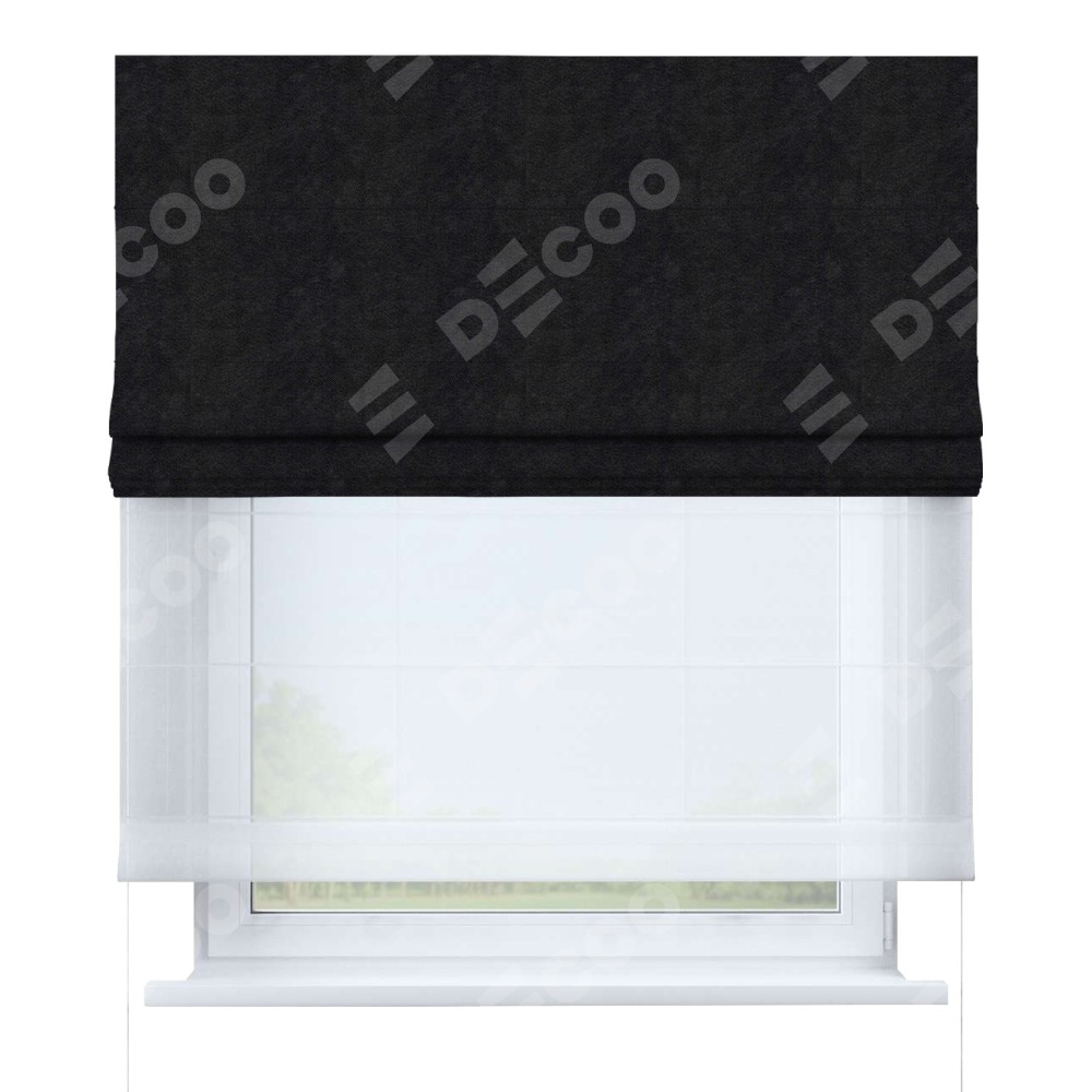 Римская штора день-ночь производителя «Cortin», используется для проёма, пошита из двух полотен, с лицевой стороны cotton блэкаут тёмно-серый артикул 35282, вторая ткань тюль (по стандарту комплектуется тюль белого цвета артикул V-01). Имеет универсальный механизм и подходит для монтажа: на потолок, на стену и в нишу.