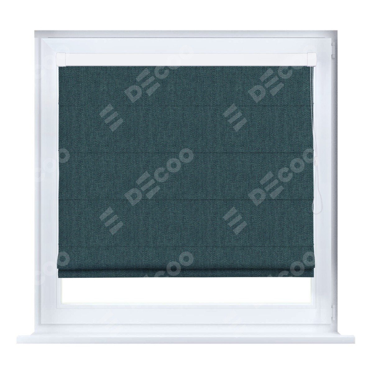 Римская штора кассетного типа, производителя «Cortin», устанавливается только на пластиковые окна и прилегает к стеклопакету, пошита из ткани лён димаут серо-синий, артикул 03238.