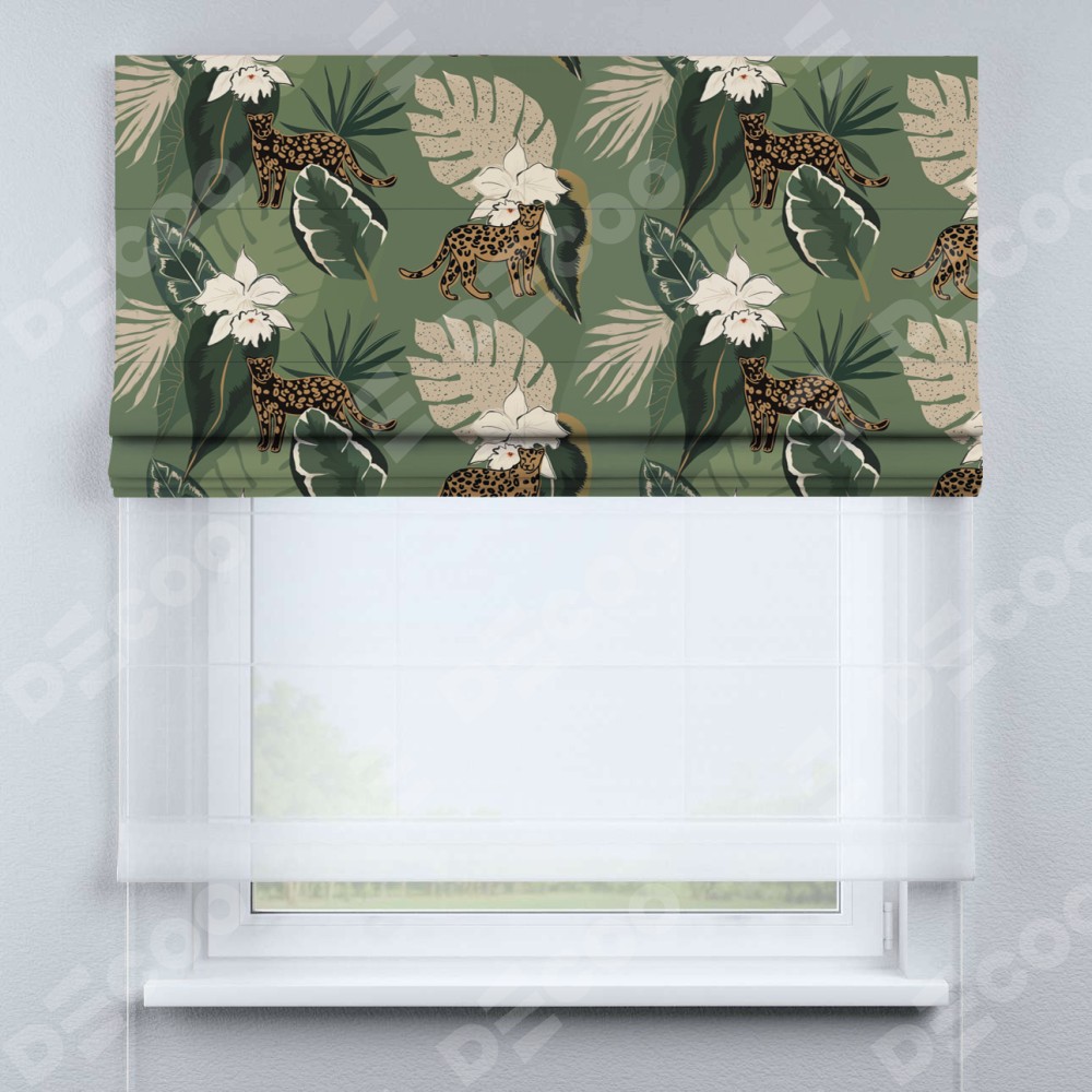Римская штора день-ночь производителя «Cortin», используется для проёма, пошита из двух полотен, с лицевой блэкаут с нанесением сублимационной печати «В тропическом лесу», вторая ткань тюль (по стандарту комплектуется тюль белого цвета артикул V-01). Имеет универсальный механизм и подходит для монтажа: на потолок, на стену и в нишу.